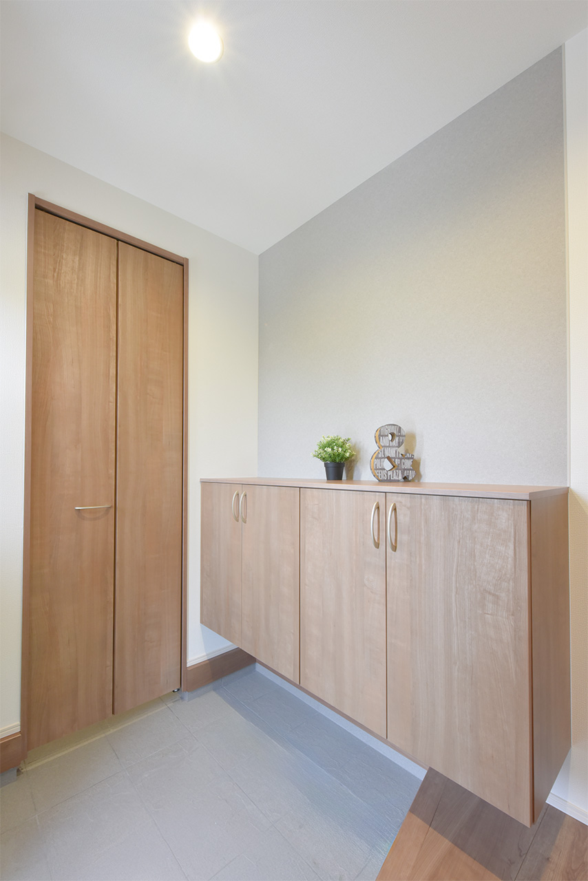 玄関ホールのそばに設けたクローゼットスペース。お出かけ用の上着やコート、レインウェアをはじめ、帽子や鞄などをまとめて収納できます。居住空間への花粉やウイルスなどの持ち込みを低減し、子ども達のお片付け習慣も自然と身につきます。