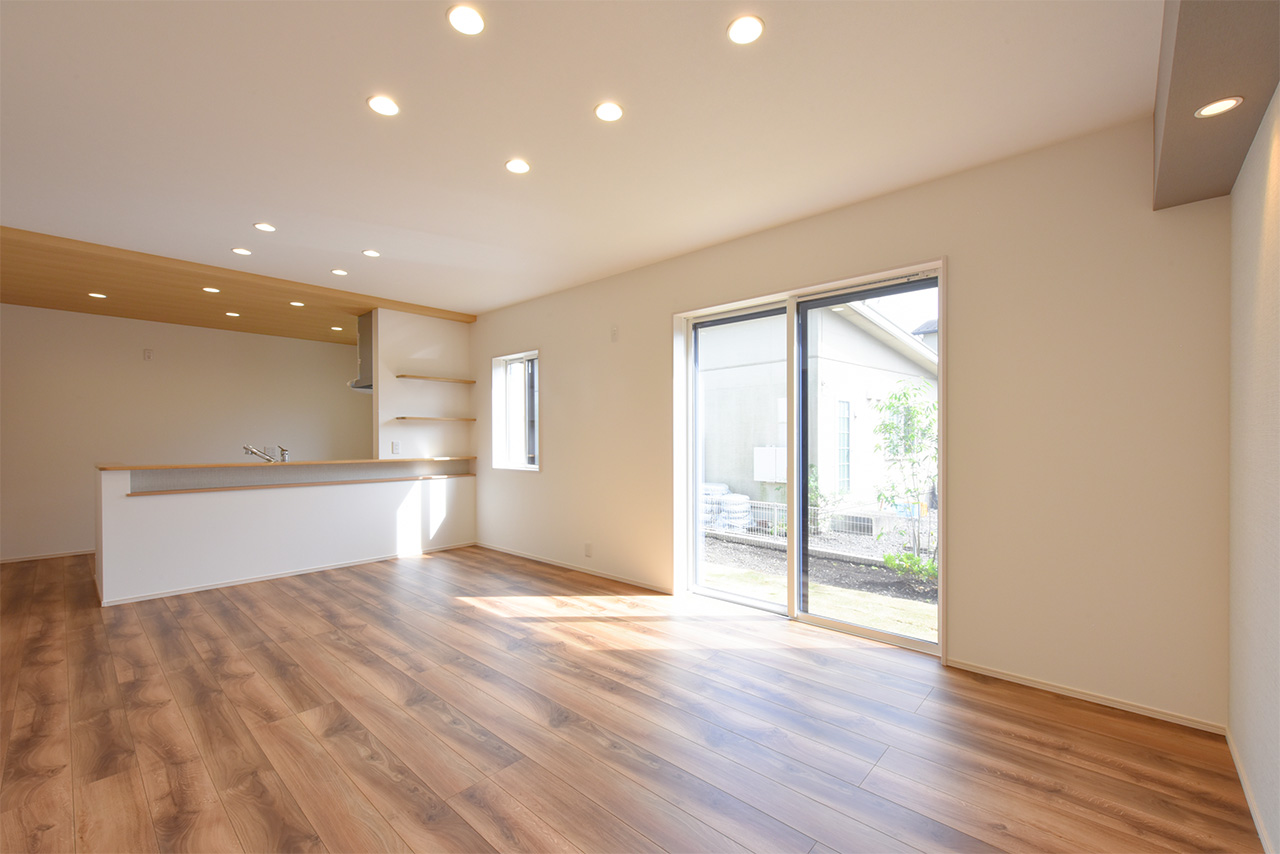 リビングと繋がり、カウンターキッチンからの視線の先に広がるテラス空間。天気の良い日は窓を開放して、ホームパーティーや子ども達のプレイスペースに。明かりに照らされた夜には、リクライニングチェアを置いて自分時間を満喫するカフェテラスに。豊かな時間を届ける贅沢な空間です。