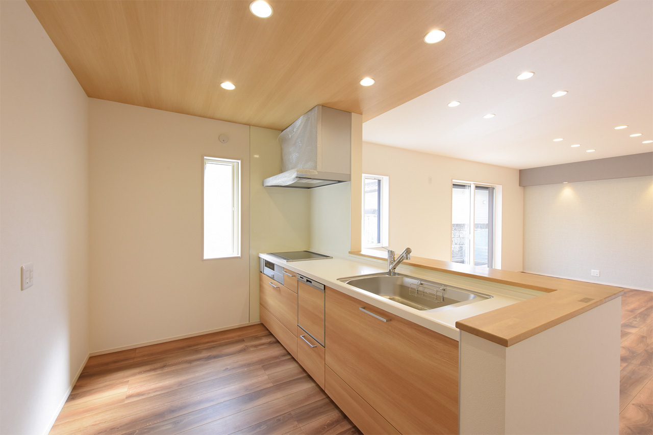 家族でのコミュニケーションがとれる対面型システムキッチンです。横一列にシンクとコンロをまとめたシンプルな形です。動きやすさとスタイリッシュなデザインが魅力です。