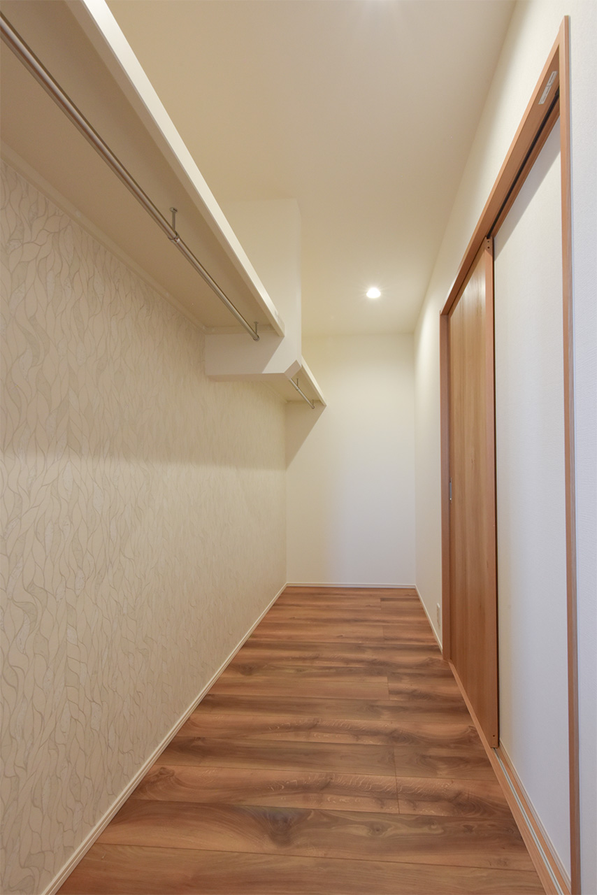 ご夫婦の衣類をたっぷり整頓できる大容量のウォークインクローゼットと、季節の家電や家具など大きな物も仕舞える納戸がひとつになった収納空間。使い勝手のいい主寝室とホールの両方から出入りできる2WAYタイプです。