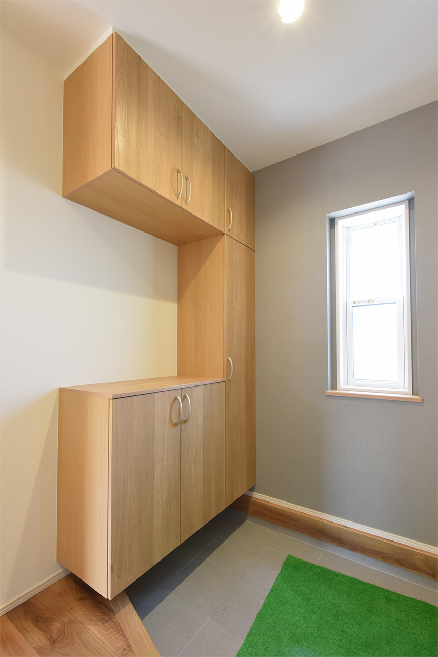 玄関ホールのそばに設けたクローゼットスペース。お出かけ用の上着やコート、レインウェアをはじめ、帽子や鞄などをまとめて収納できます。居住空間への花粉やウイルスなどの持ち込みを低減し、子ども達のお片付け習慣も自然と身につきます。