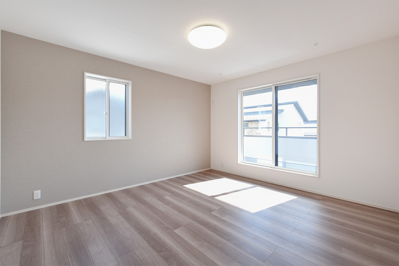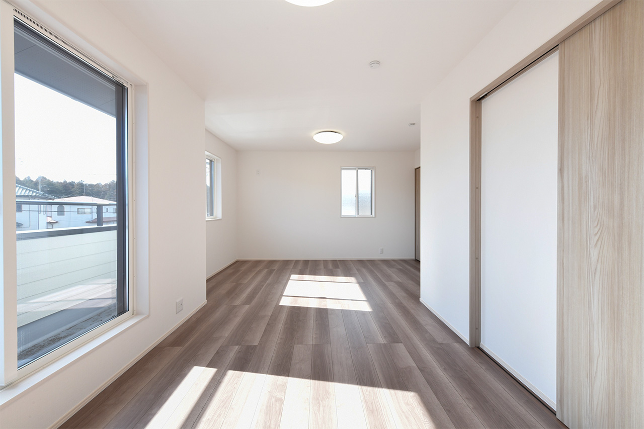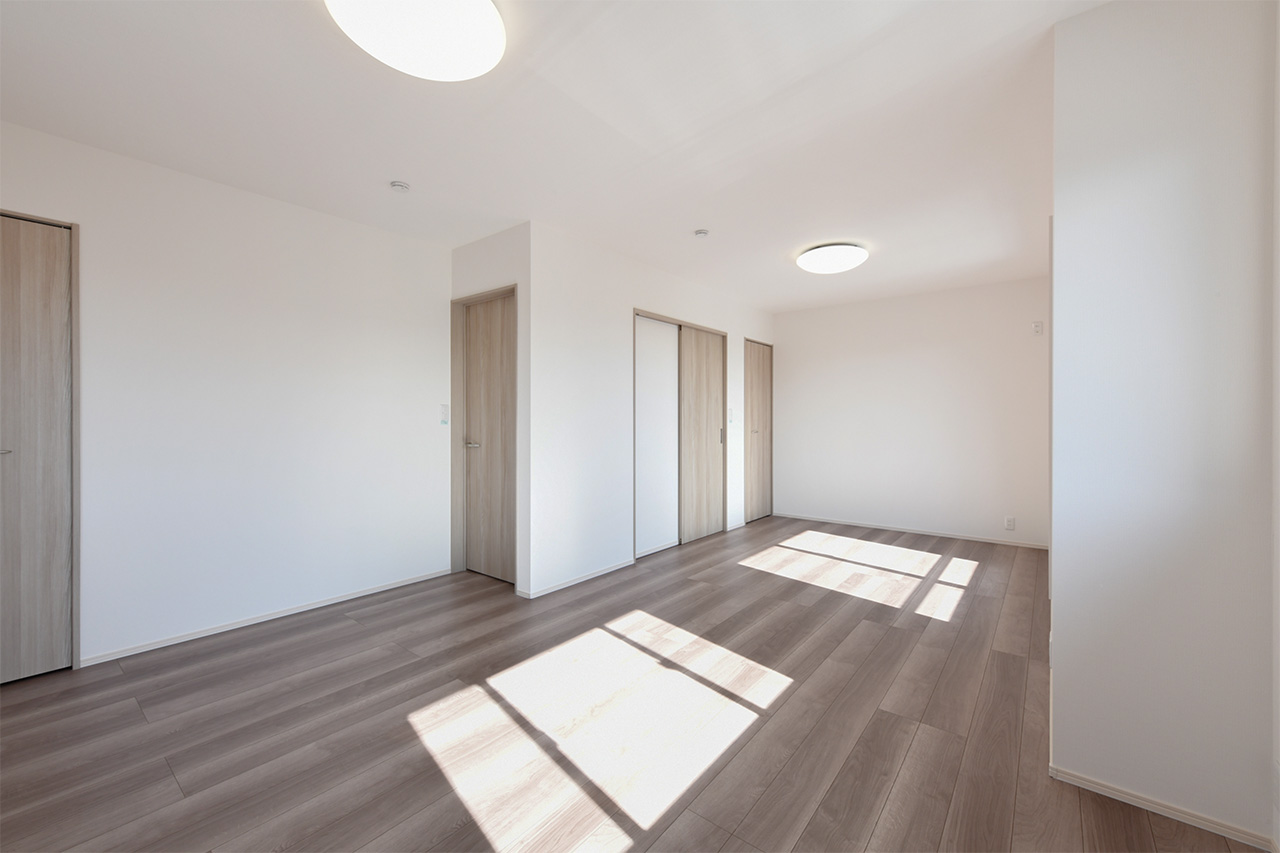 2つの空間に間仕切り可能な、広々とした2階2ドア1ルーム。子供が生まれる前、赤ちゃんが生まれてから、そして大きくなって個室を持つようになるまで対応。子ども達が独立したら広々としたご夫婦の書斎や趣味の部屋にも。ご家族の成長といっしょに変わっていく自由な家づくりが可能です。※間仕切り壁の設置は有料オプションとなります。
