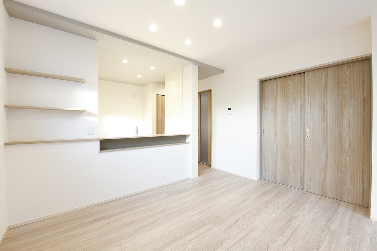 システムキッチンのすぐそばに配置したパントリー。ストック食品や調味料やお酒のほか、非常食や水のペットボトルなどの防災用品も収納できます。キッチンからすぐ手が届く場所にあるから、整理整頓もテキパキできて、キッチン空間をスッキリ保てます。
