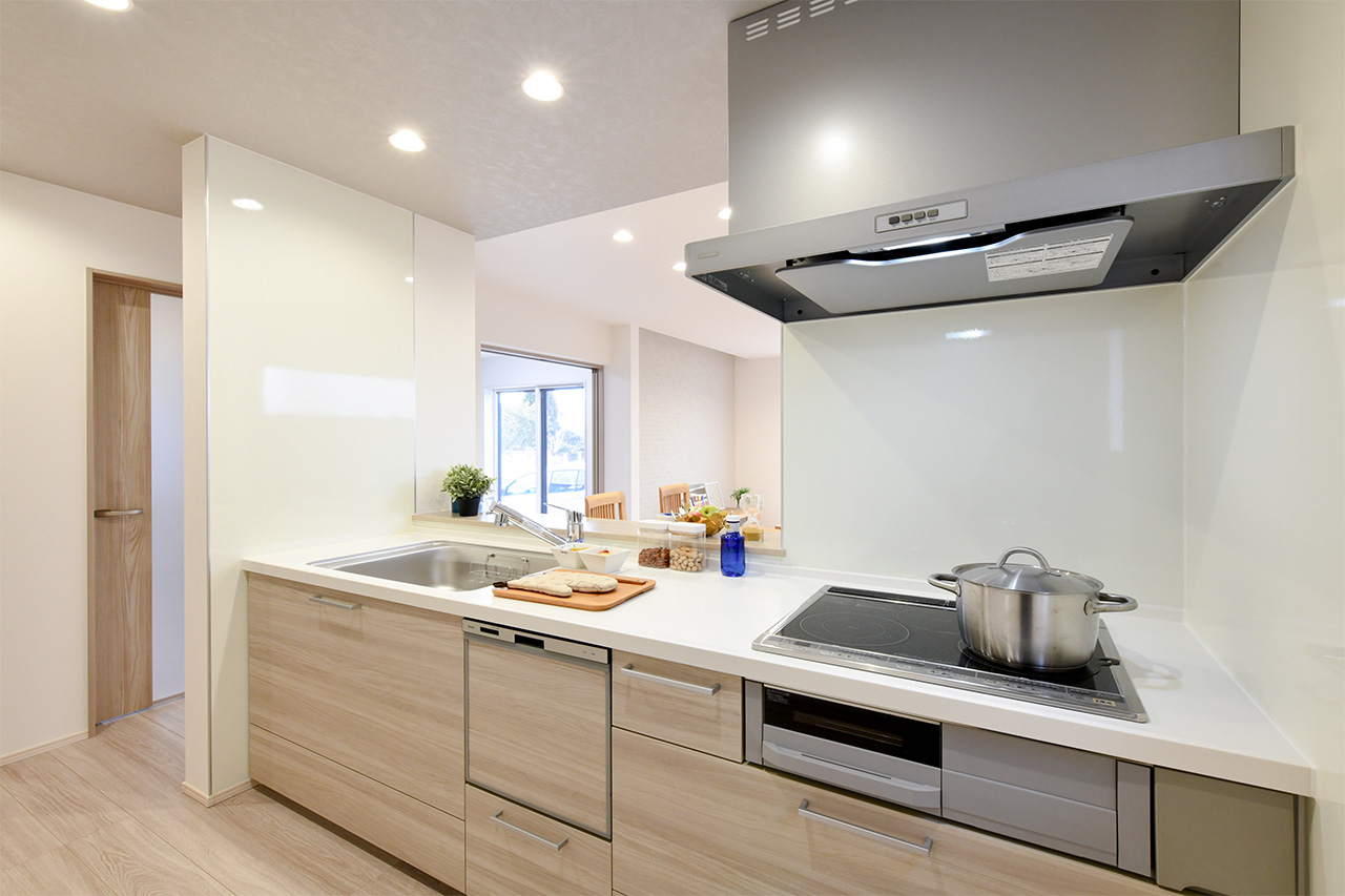 家族でのコミュニケーションがとれる対面型システムキッチンです。横一列にシンクとコンロをまとめたシンプルな形です。動きやすさとスタイリッシュなデザインが魅力です。