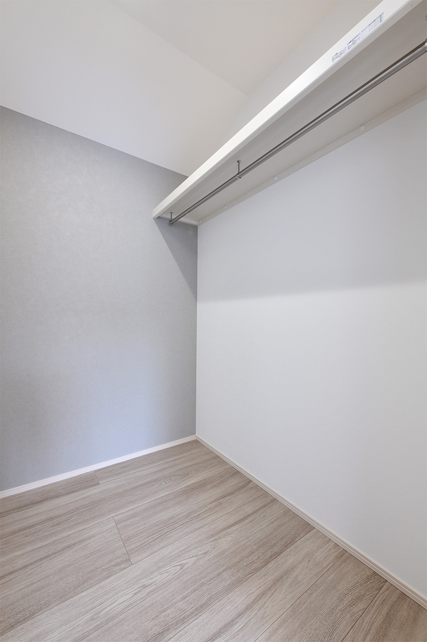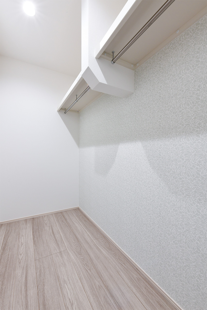 ご夫婦や子ども達の衣類をたっぷりしまえる大容量のウォークインクローゼット。季節の衣類から鞄や帽子などの小物までたっぷり保管可能。ウォークインタイプなので衣類の出し入れや整理整頓もスムーズに行えます。