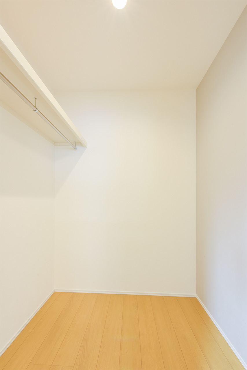 ご夫婦や子ども達の衣類をたっぷりしまえる大容量のウォークインクローゼット。季節の衣類から鞄や帽子などの小物までたっぷり保管可能。ウォークインタイプなので衣類の出し入れや整理整頓もスムーズに行えます。