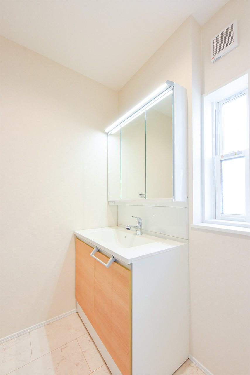 900mm幅の洗面化粧台なので広く使え、毎日の作業もグンと楽になります。ゆとりの収納力でサニタリールームをすっきりと演出します。