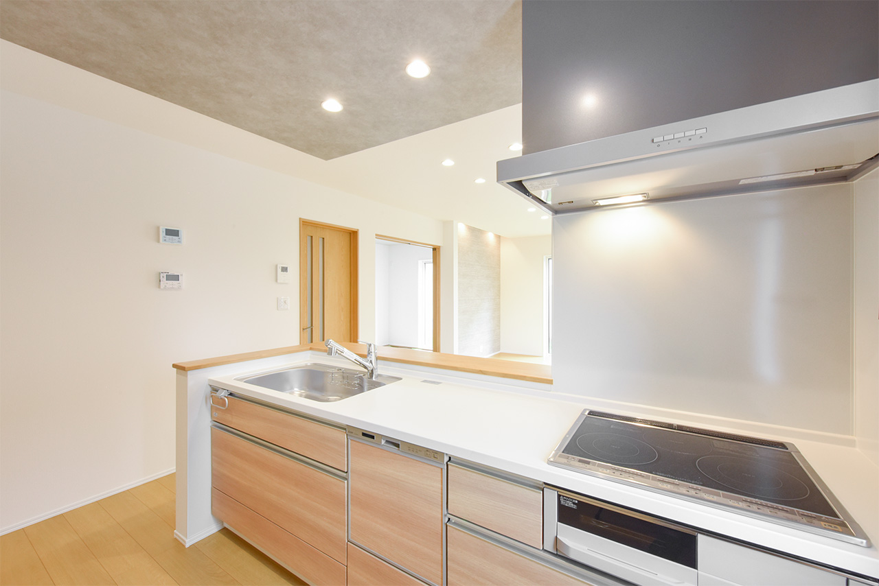 家族でのコミュニケーションがとれる対面型システムキッチン。横一列にシンクとコンロをまとめたシンプルな形です。動きやすさとスタイリッシュなデザインが魅力。