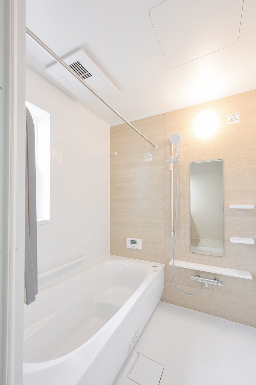 雨の日も気にせず洗濯物が浴室内に干せる浴室換気乾燥暖房機を標準装備。時間も天気も気にせず干せるからとても便利。また、浴室のジメジメした環境から発生するカビも抑えることができます。