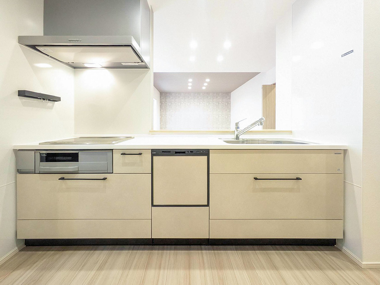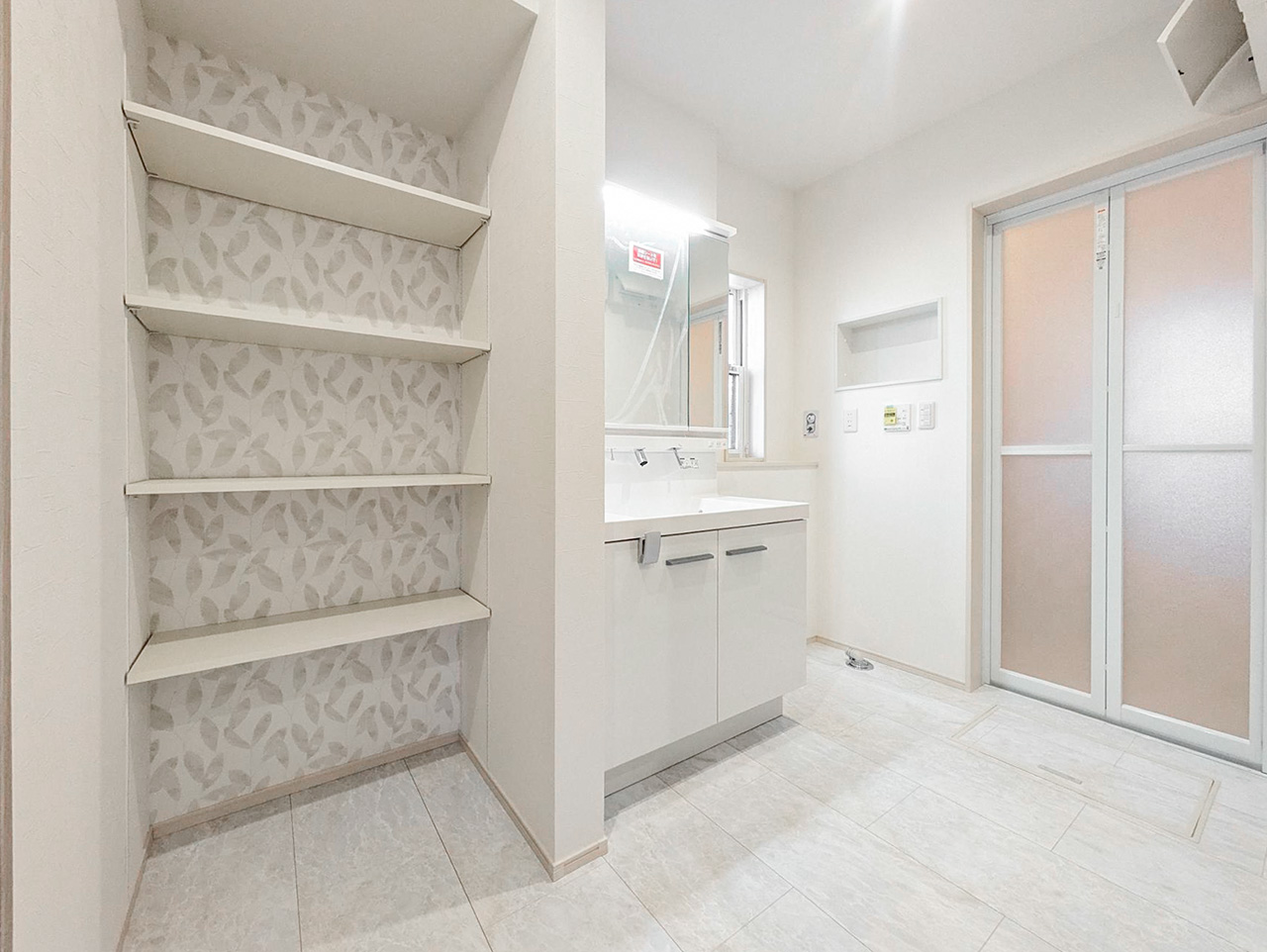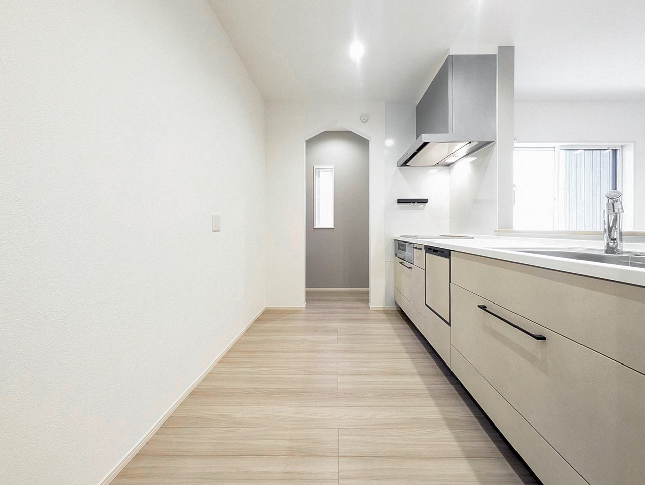 キッチンから洗面室・浴室までを最短距離で結んだ水回り動線設計。家事の移動距離を短縮するとともに、動線上には収納スペースなどをレイアウトし機能性も高めました。スマートな動線設計と時短設備が子育てにがんばるご家族をサポートします。