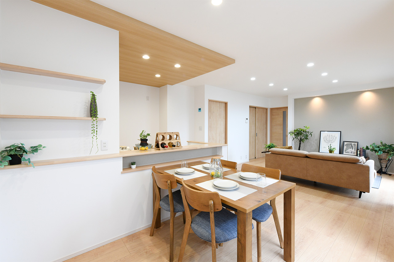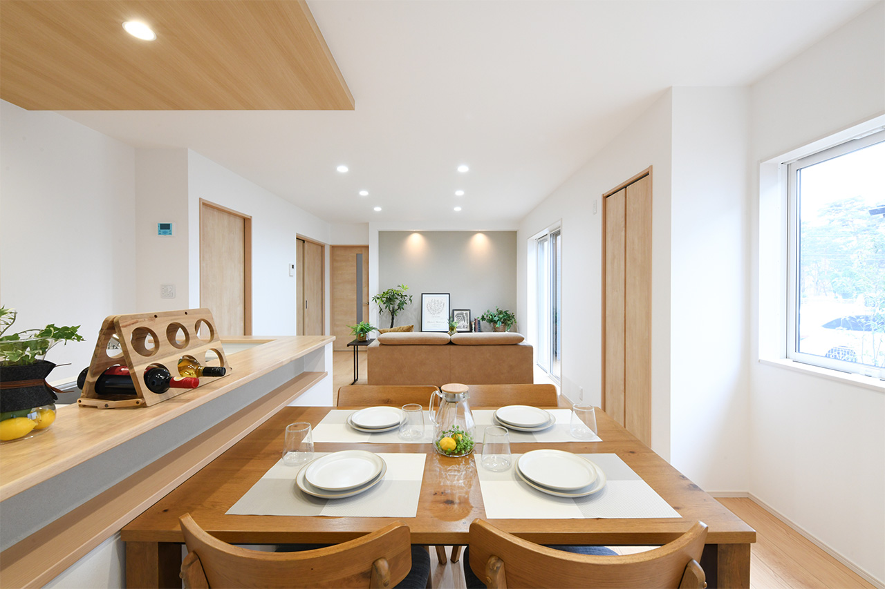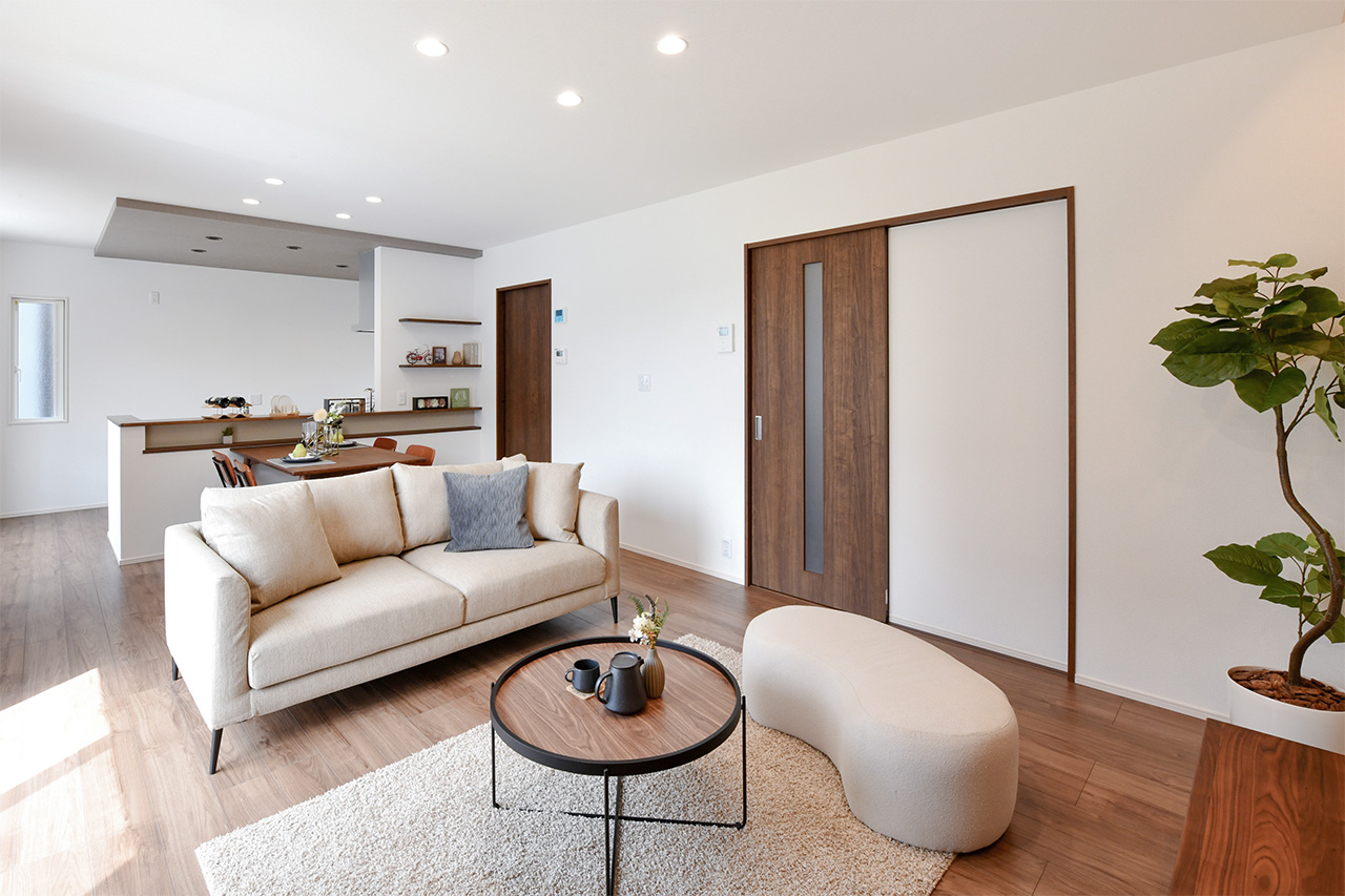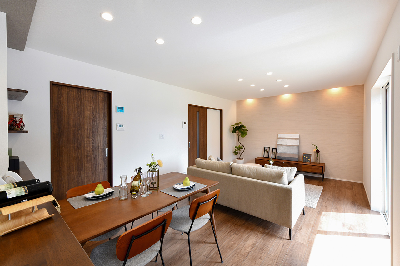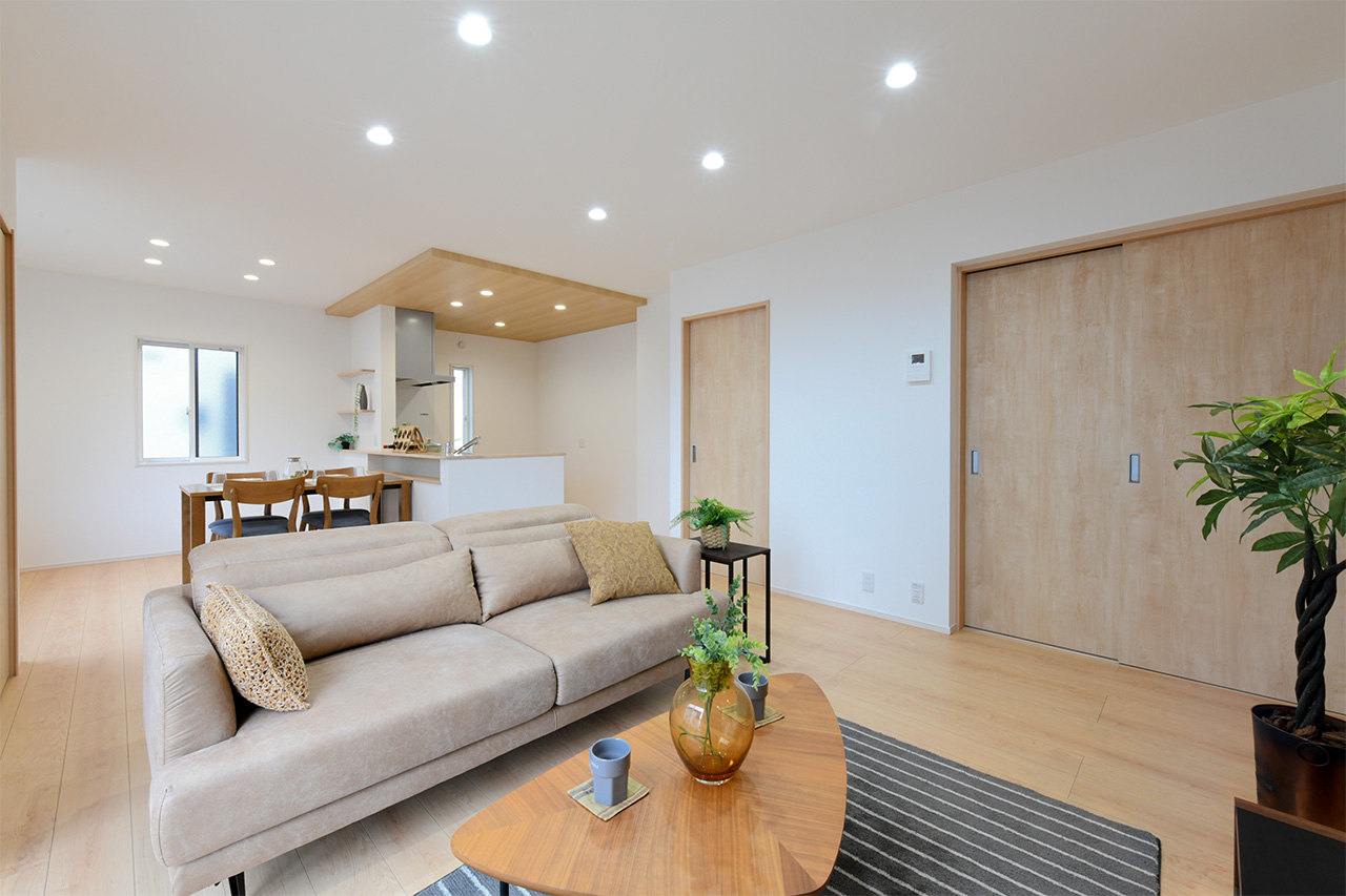 リビングという暮らしのメインスペースは、一日で家族が一番長く過ごす場所。その居心地をさらに高めるために18帖以上のワイドな広さを確保しました。広場のようなパブリックスペースがご家族の集いや団らんを心地よく育みます。