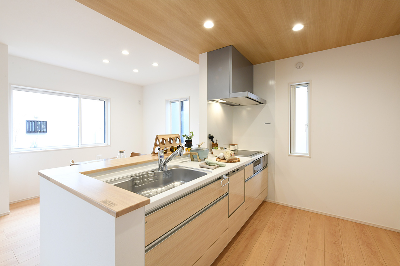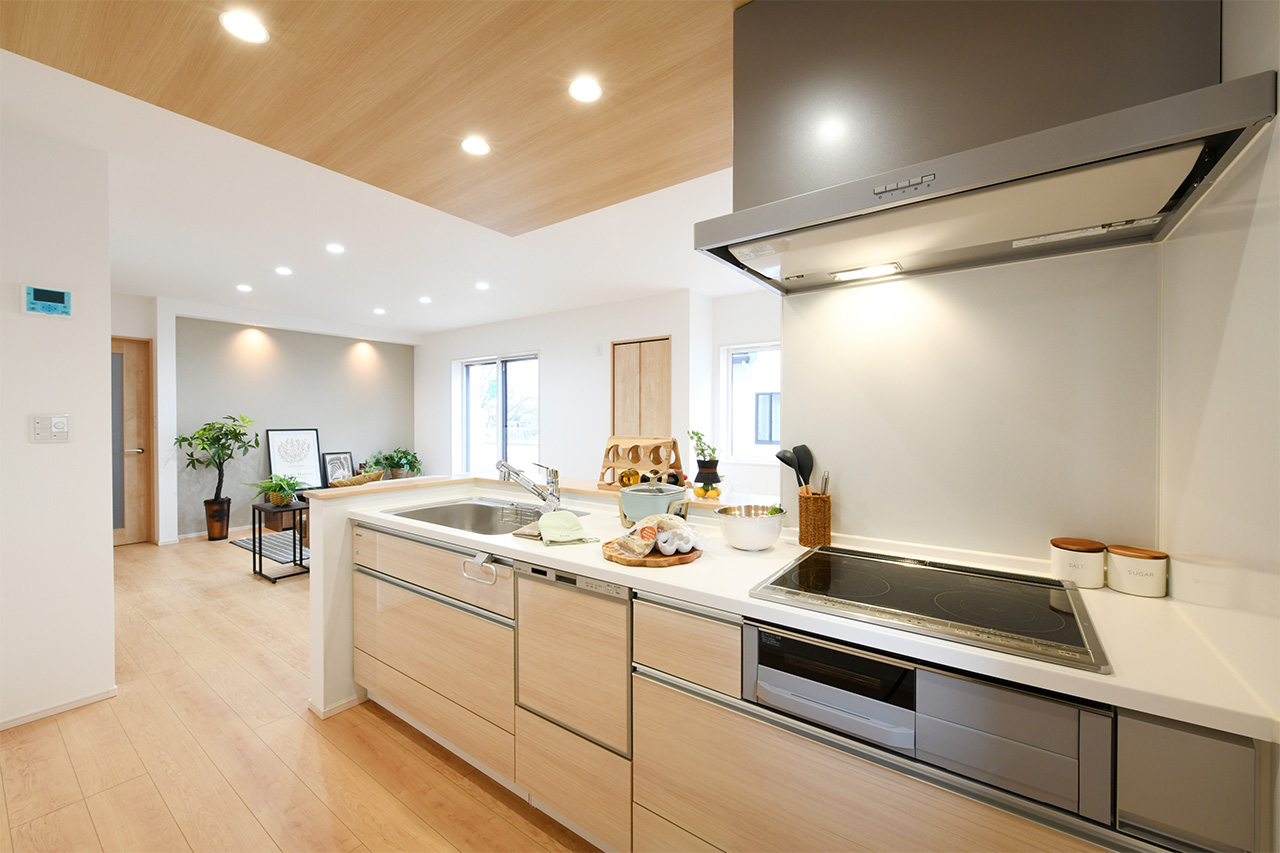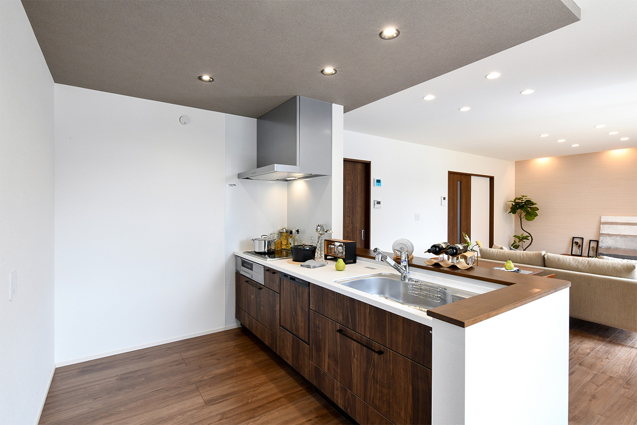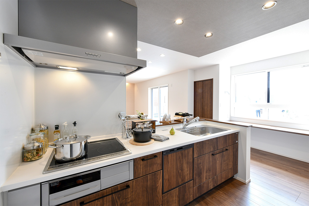 家族でのコミュニケーションがとれる対面型システムキッチン。横一列にシンクとコンロをまとめたシンプルな形です。動きやすさとスタイリッシュなデザインが魅力。
