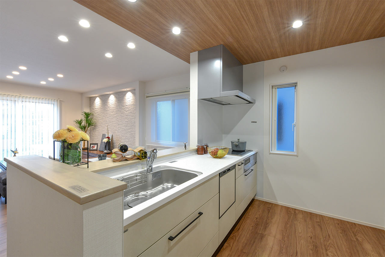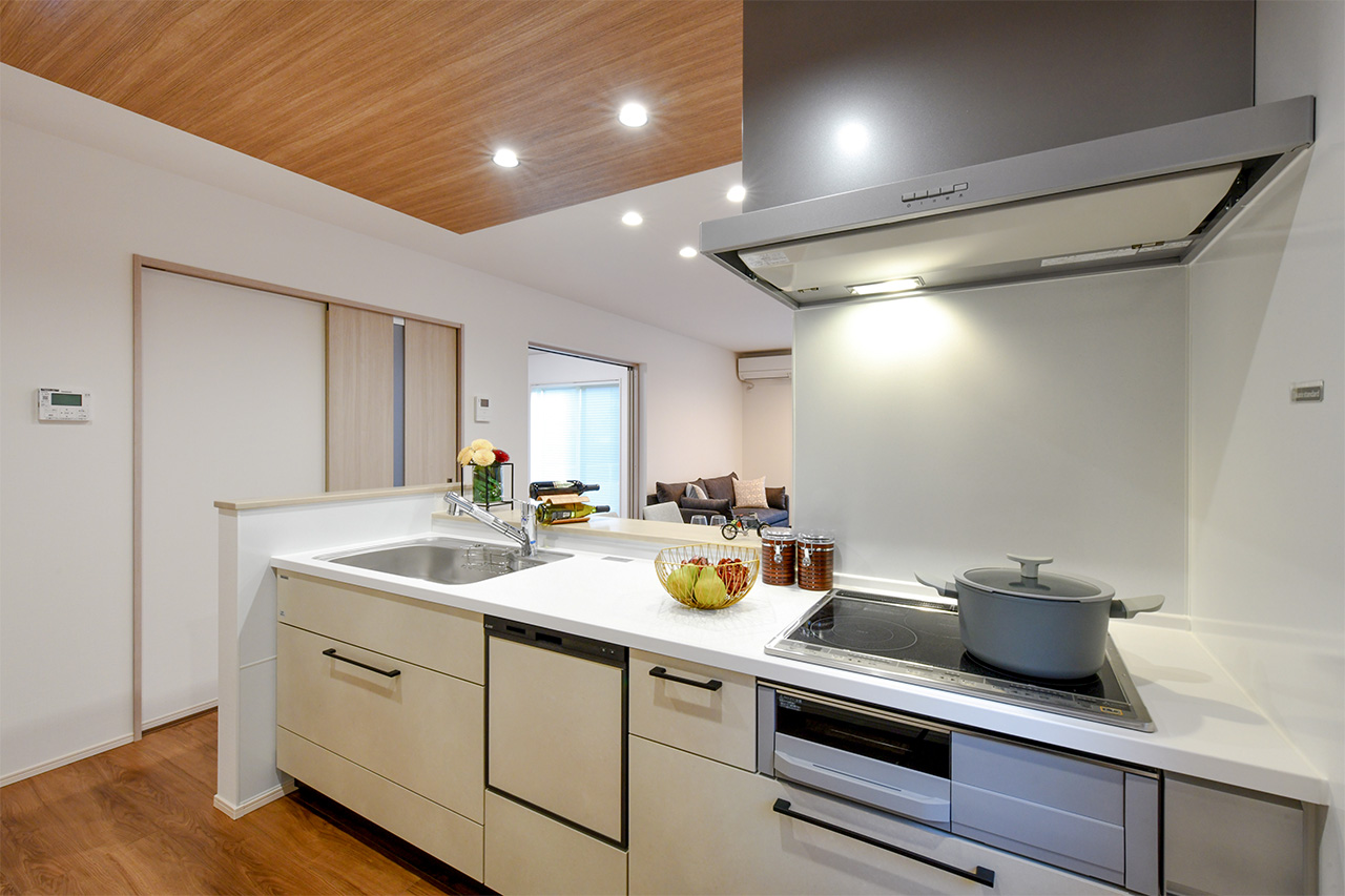 家族でのコミュニケーションがとれる対面型システムキッチン。横一列にシンクとコンロをまとめたシンプルな形です。動きやすさとスタイリッシュなデザインが魅力。