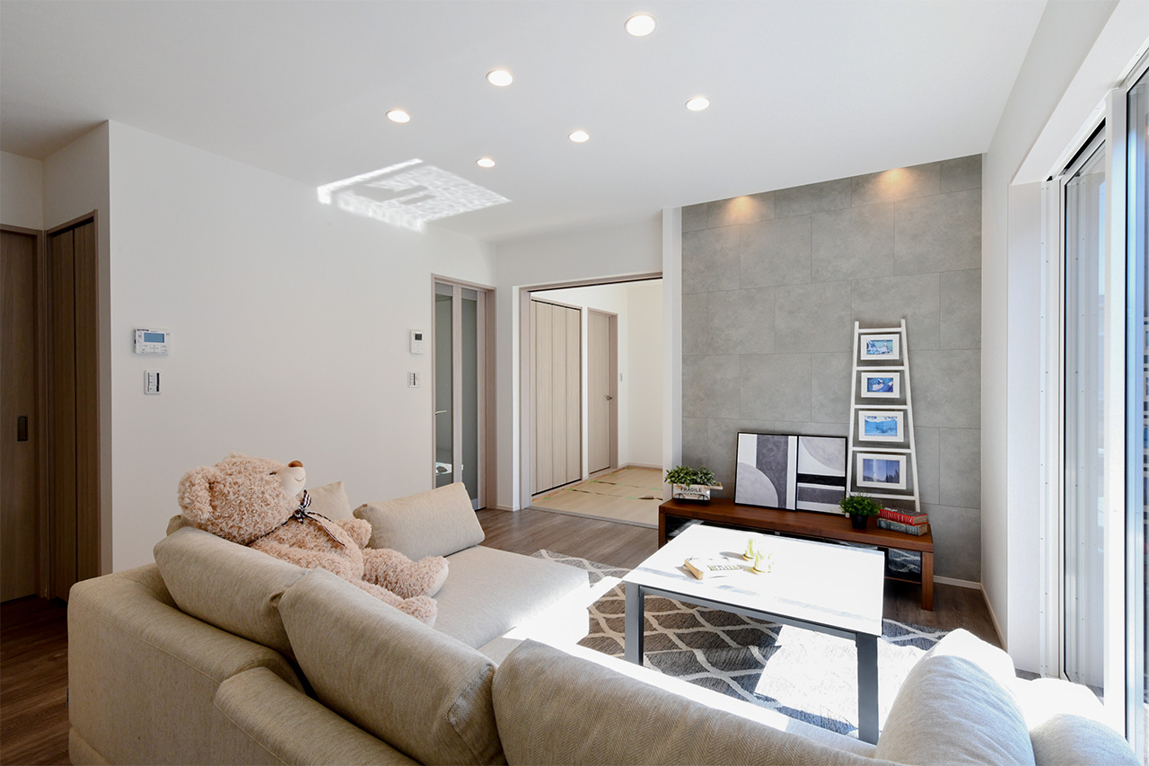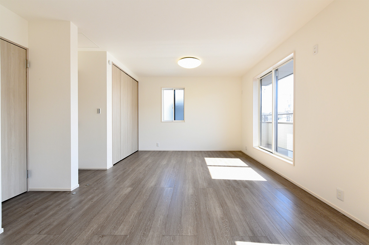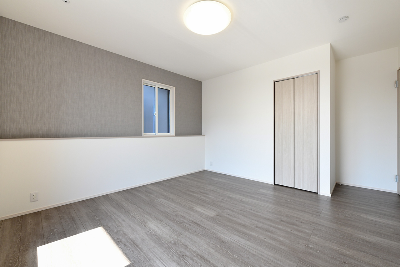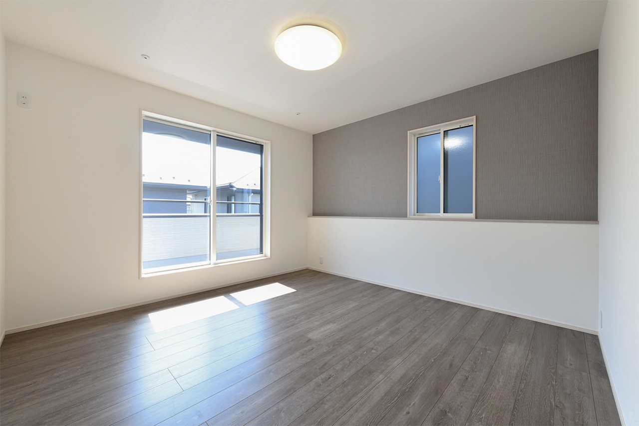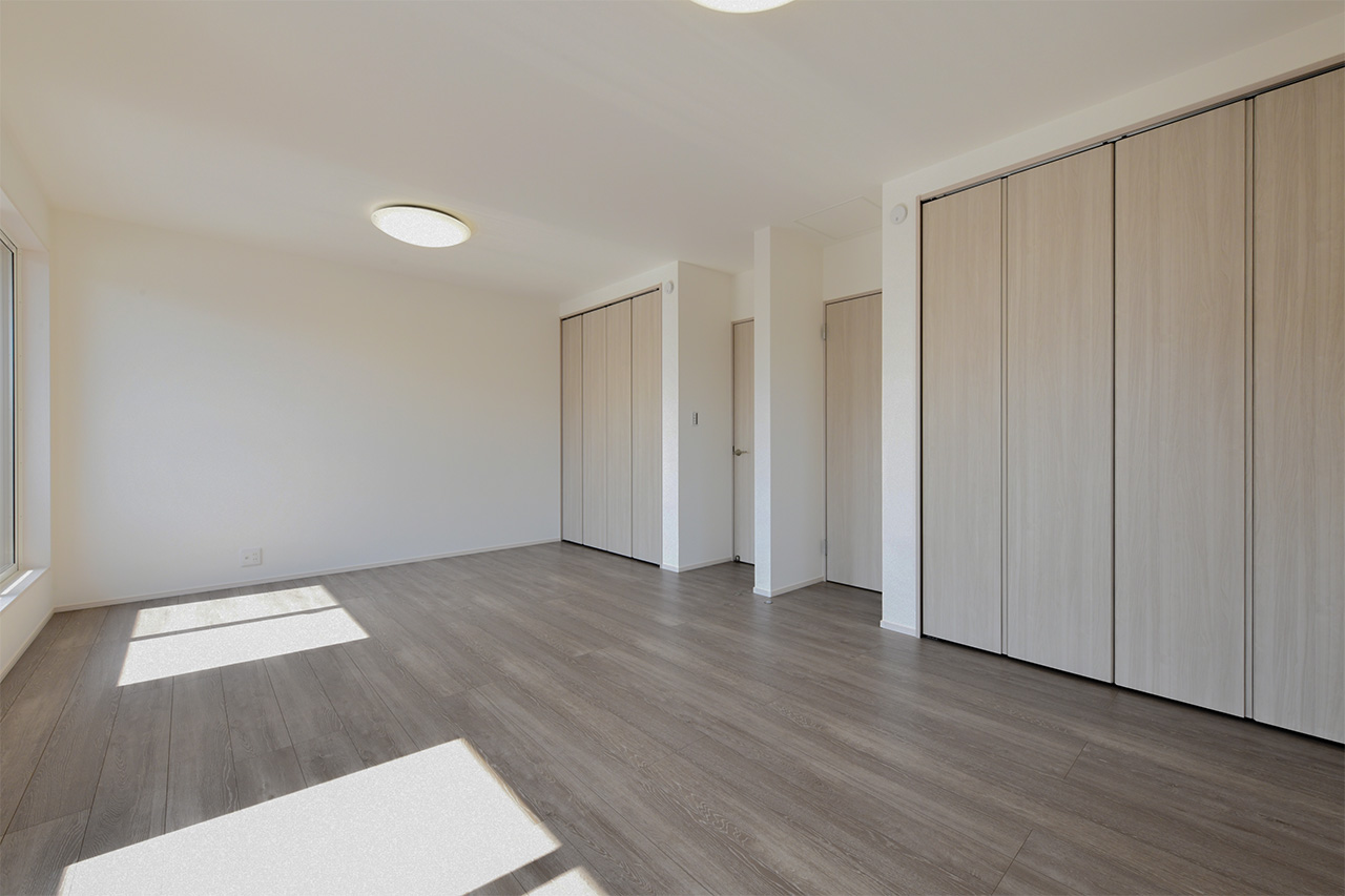 2つの空間に間仕切り可能な、広々とした2階2ドア1ルーム。子供が生まれる前、赤ちゃんが生まれてから、そして大きくなって個室を持つようになるまで対応。子ども達が独立したら広々としたご夫婦の書斎や趣味の部屋にも。ご家族の成長といっしょに変わっていく自由な家づくりが可能です。※間仕切り壁の設置は有料オプションとなります。