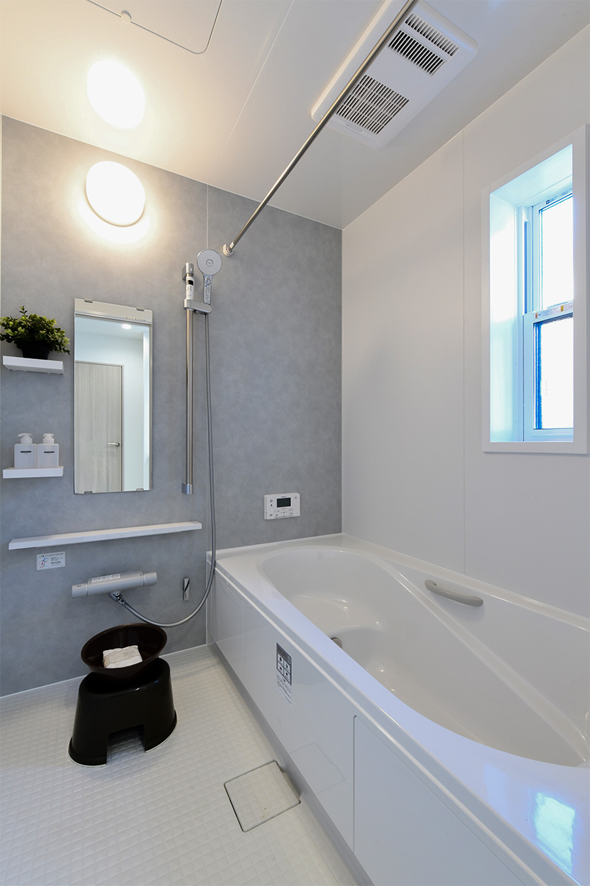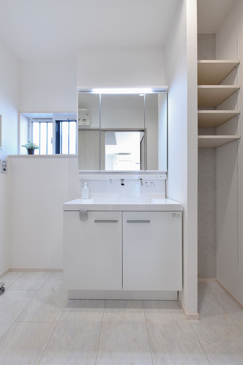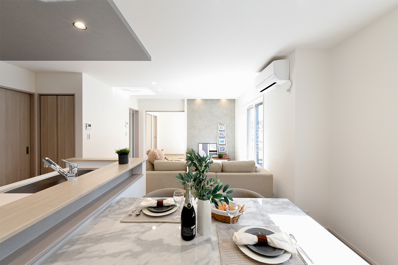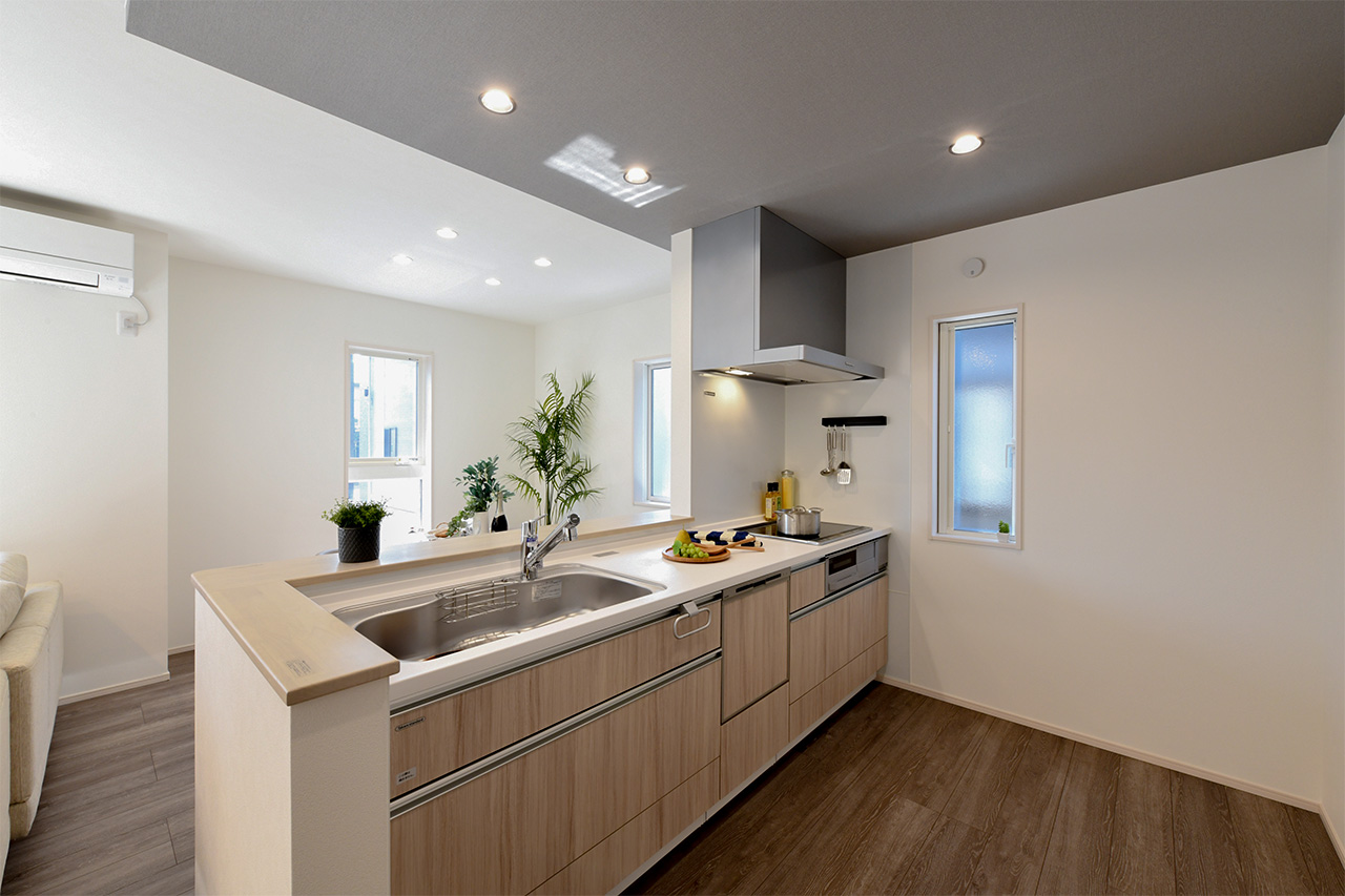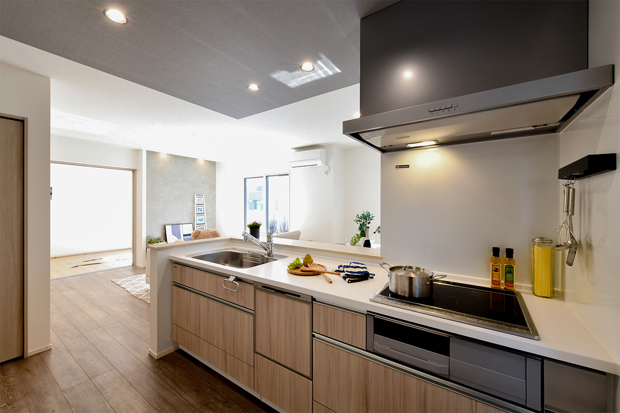 キッチンから洗面室・浴室までを最短距離で結んだ水回り動線設計。家事の移動距離を短縮するとともに、動線上には収納スペースなどをレイアウトし機能性も高めました。スマートな動線設計と時短設備が子育てにがんばるご家族をサポートします。