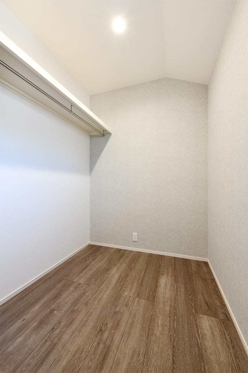 ご夫婦や子ども達の衣類をたっぷりしまえる大容量のウォークインクローゼット。季節の衣類から鞄や帽子などの小物までたっぷり保管可能。ウォークインタイプなので衣類の出し入れや整理整頓もスムーズに行えます。