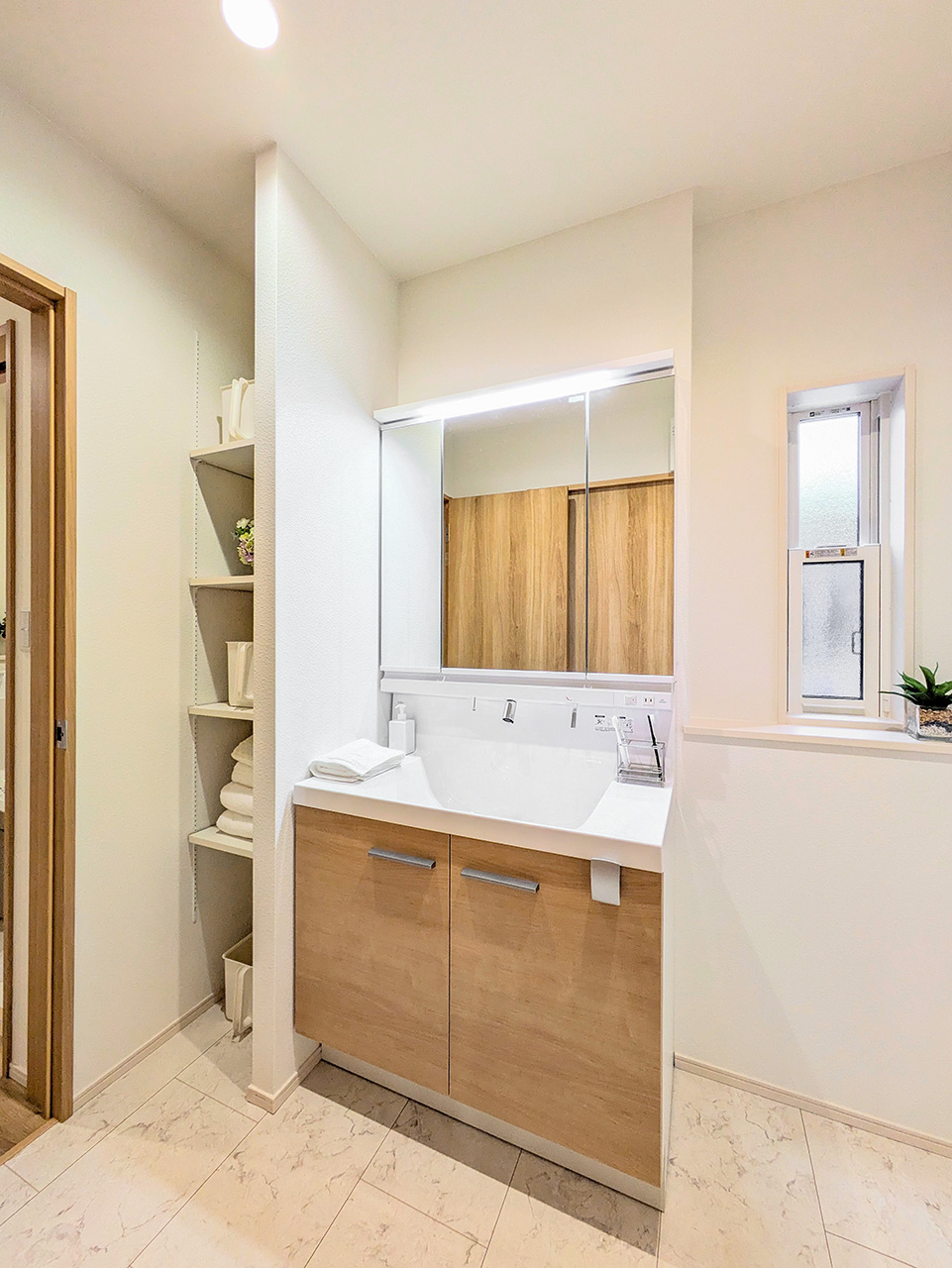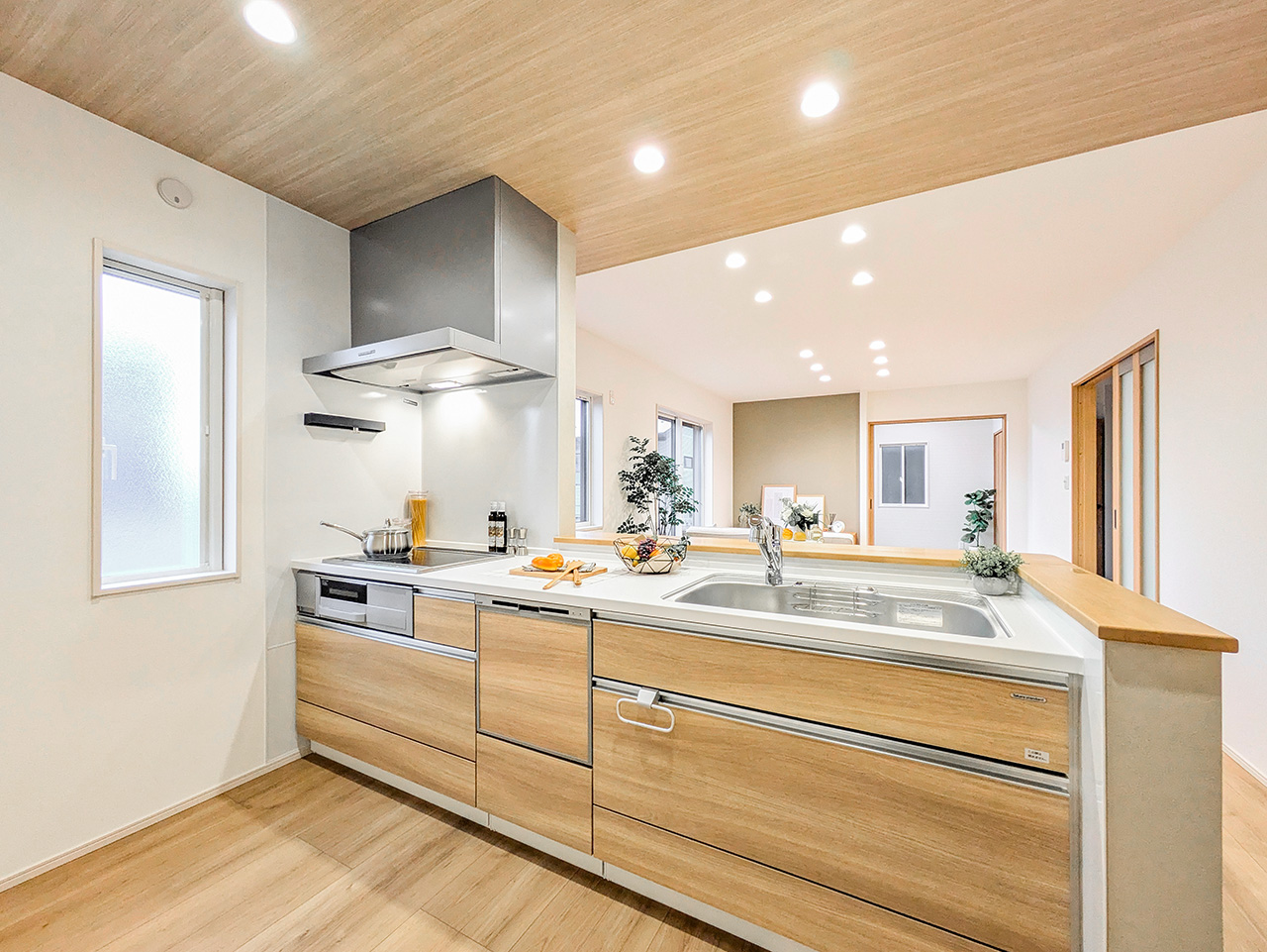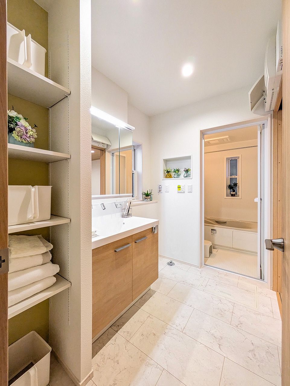 キッチンから洗面室・浴室までを最短距離で結んだ水回り動線設計。家事の移動距離を短縮するとともに、動線上には収納スペースなどをレイアウトし機能性も高めました。スマートな動線設計と時短設備が子育てにがんばるご家族をサポートします。