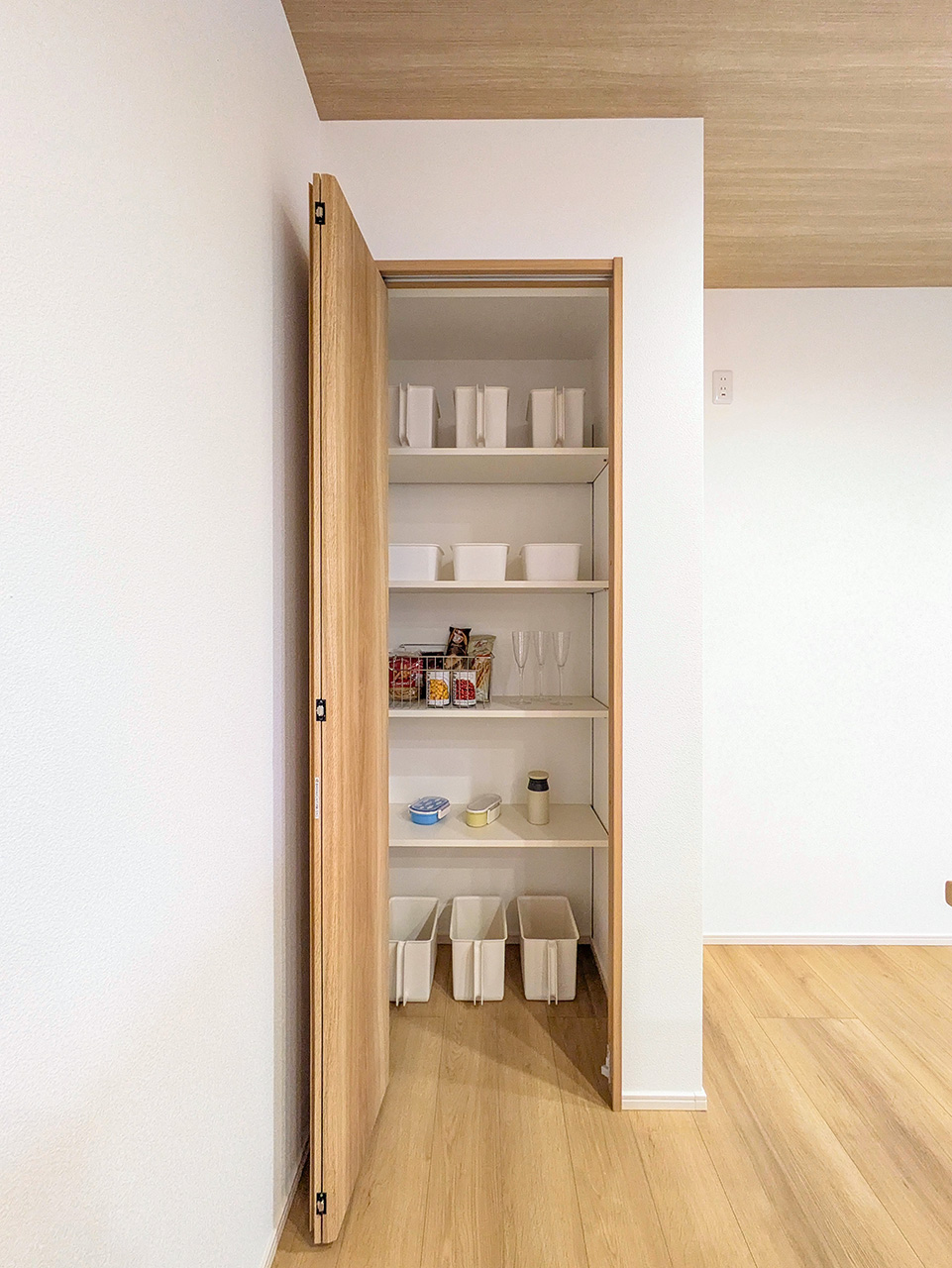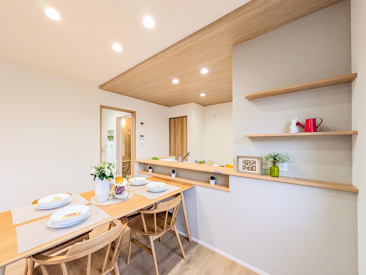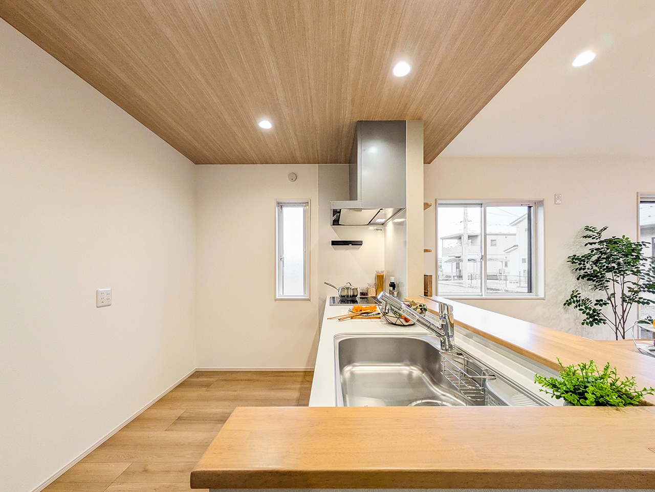 キッチンから洗面室・浴室までを最短距離で結んだ水回り動線設計。家事の移動距離を短縮するとともに、動線上には収納スペースなどをレイアウトし機能性も高めました。スマートな動線設計と時短設備が子育てにがんばるご家族をサポートします。