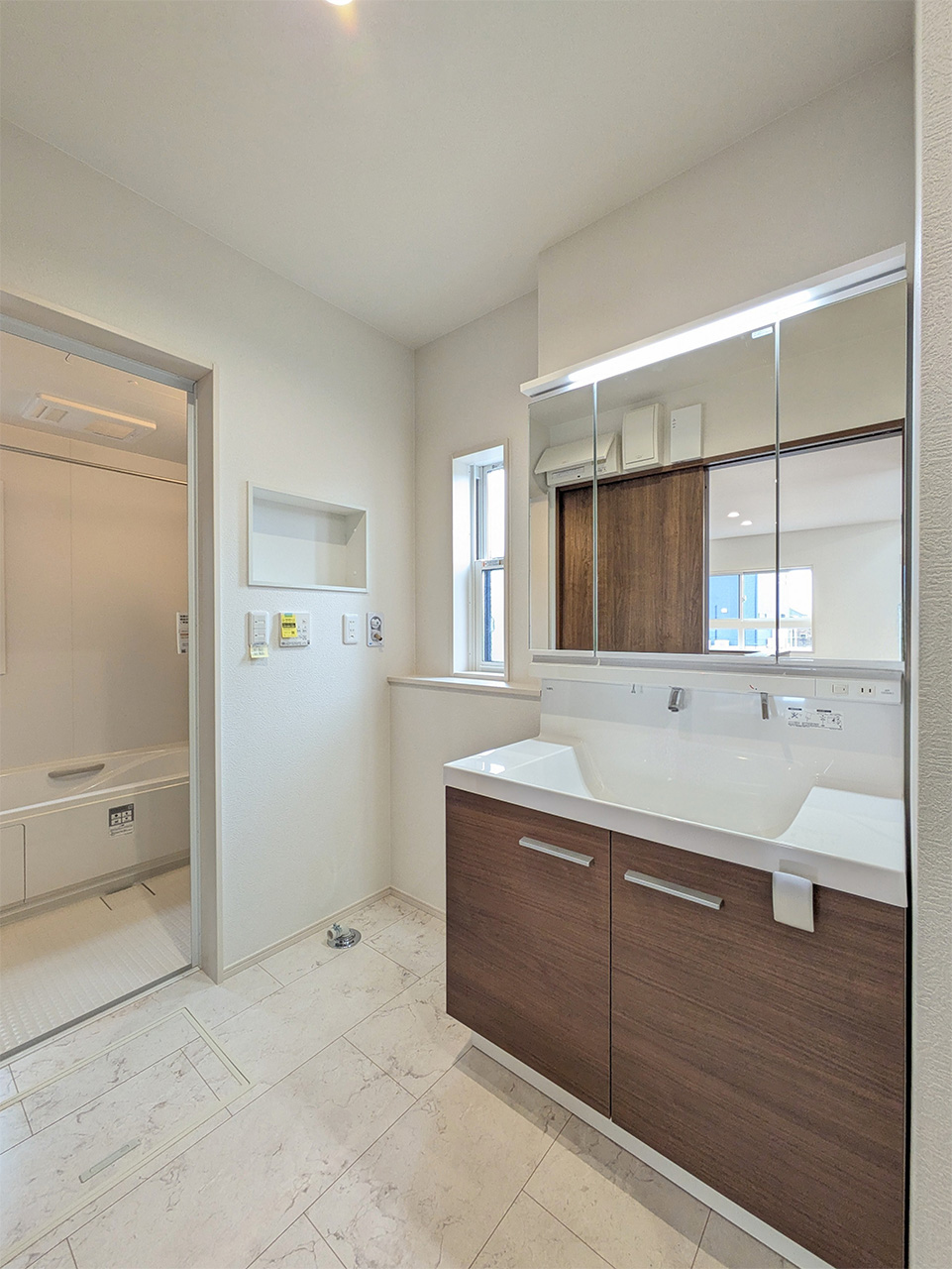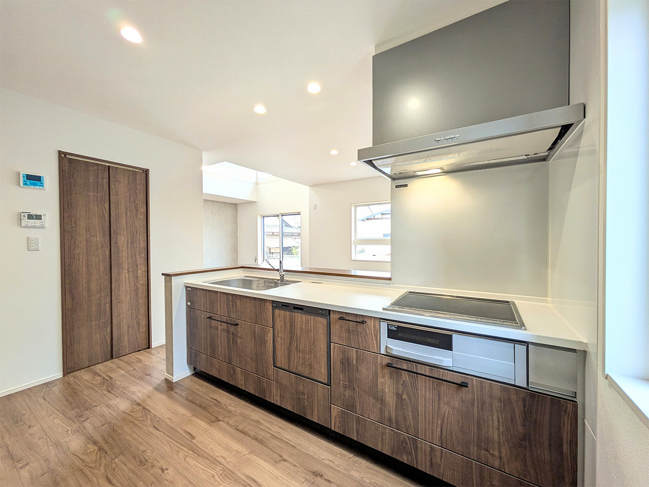 キッチンから洗面室・浴室までを最短距離で結んだ水回り動線設計。家事の移動距離を短縮するとともに、動線上には収納スペースなどをレイアウトし機能性も高めました。スマートな動線設計と時短設備が子育てにがんばるご家族をサポートします。