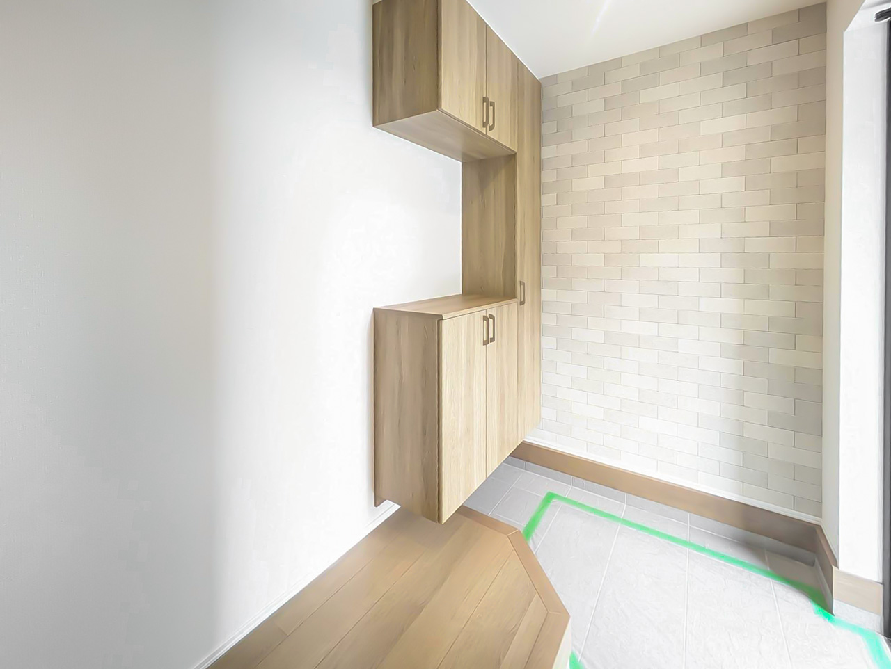 広々とした空間と明るい採光性を確保した玄関エントランス。暗くて狭い玄関スペースのイメージを一新しました。広さを活かして、ベビーカーや自転車・家族で楽しむアウトドア用品などを土間部分に置くこともできます。