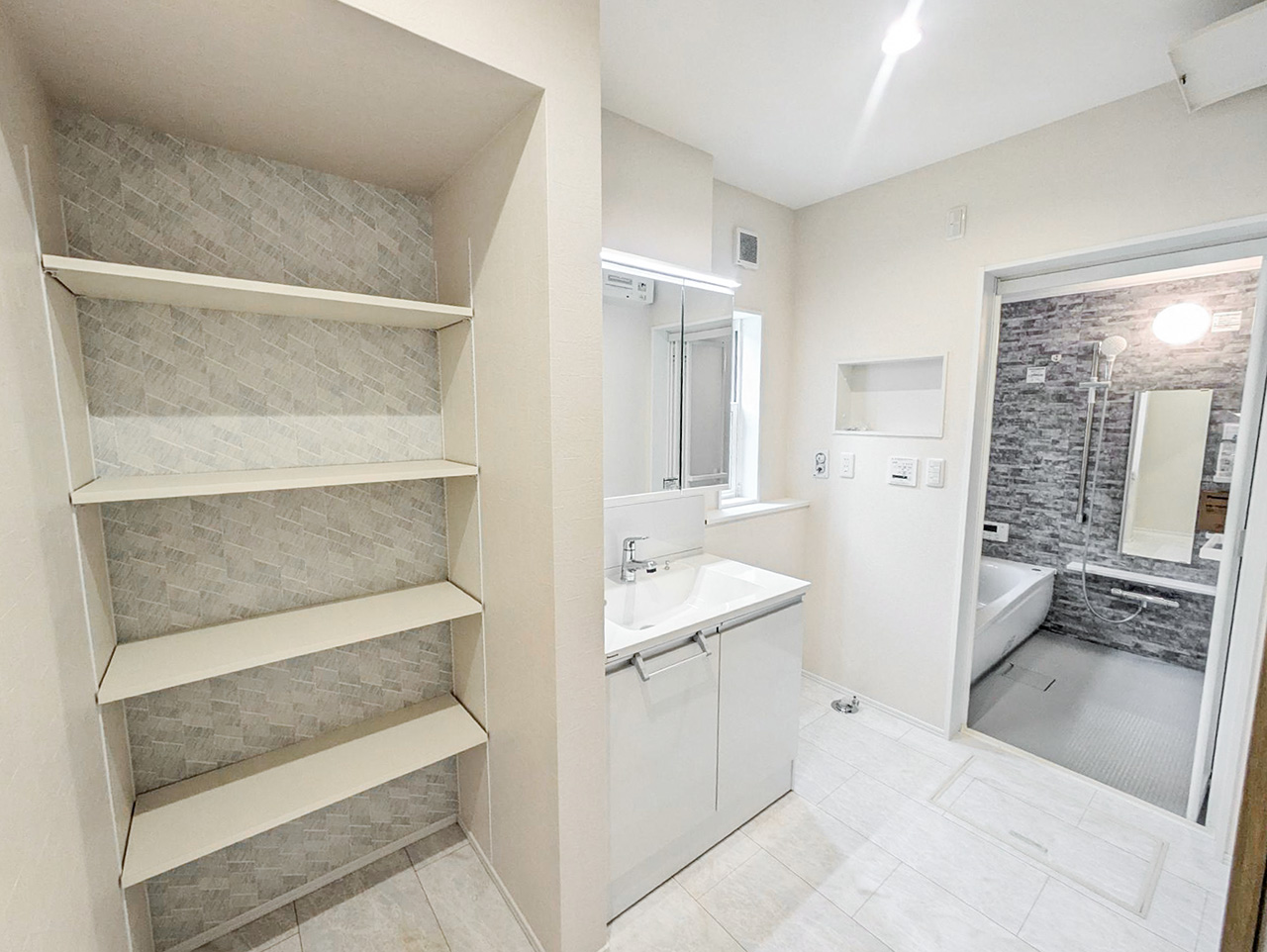 タオルや洗濯用品などのストックに嬉しいリネン庫。入浴後の下着やパジャマの置き場所としてもとっても便利。カゴやケースを利用して、バスタオルや下着類、洗濯物など種類別に整理して、見た目も使い勝手もスマートに。そのまま洗濯機に入れたくない汚れた洗濯物は一番下のスペースに。家族のなかでルールを決めて誰でも使いやすく。子ども達の自主性も育みます。