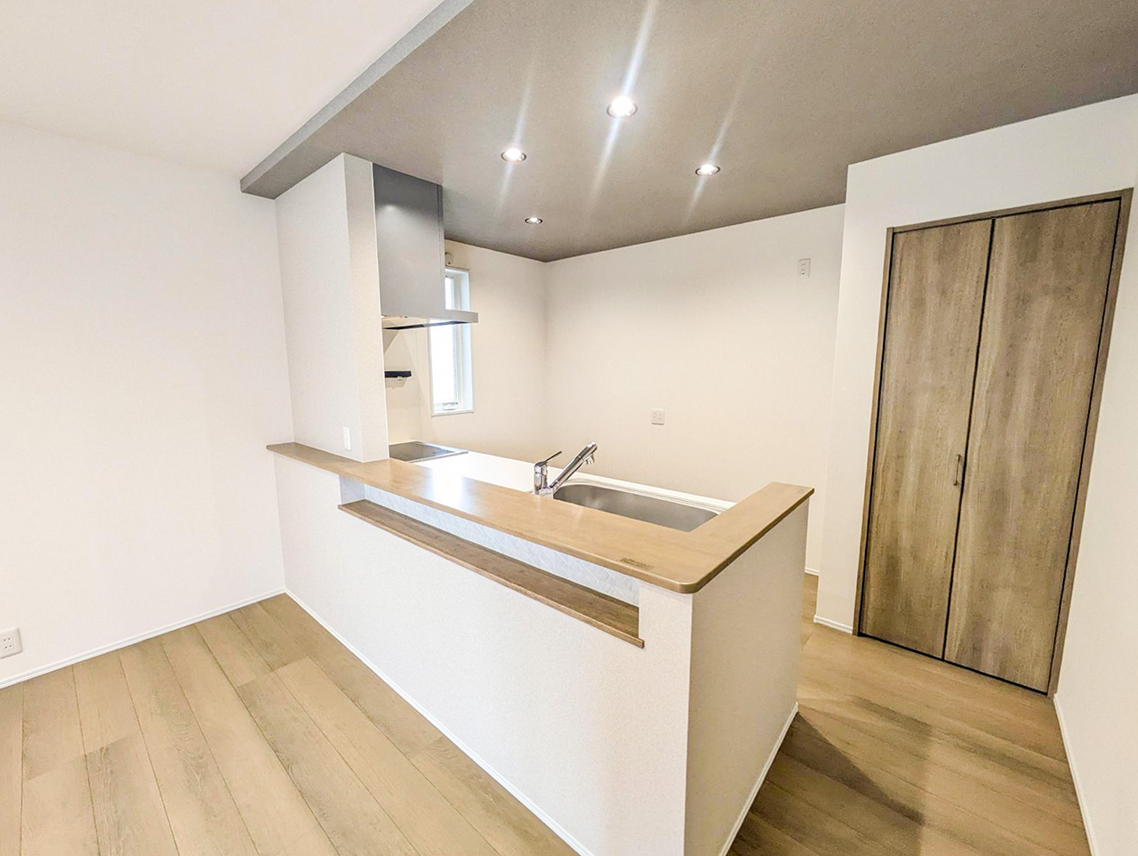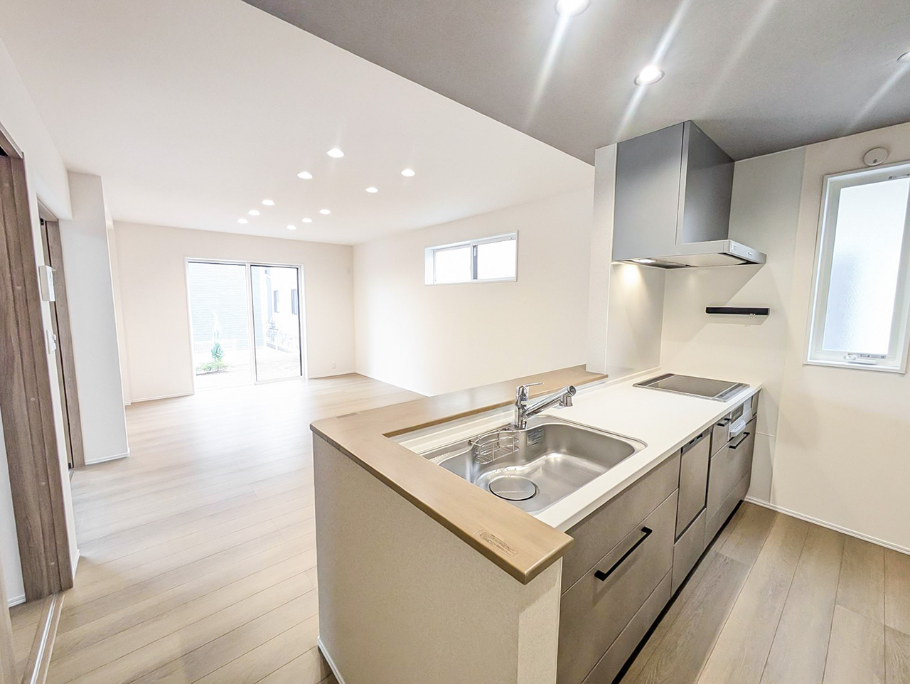 家族でのコミュニケーションがとれる対面型システムキッチンです。横一列にシンクとコンロをまとめたシンプルな形です。動きやすさとスタイリッシュなデザインが魅力です。