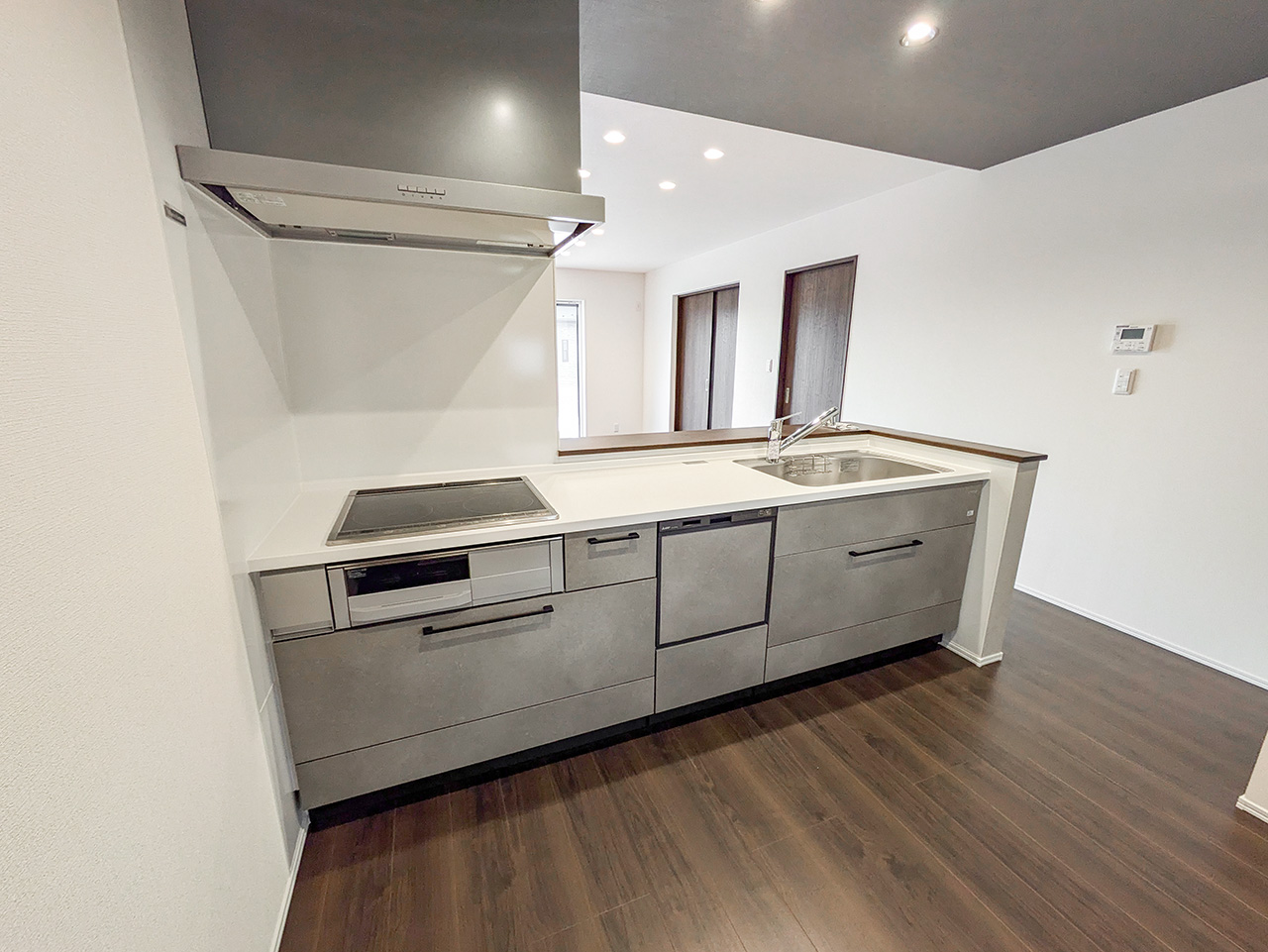 家族でのコミュニケーションがとれる対面型システムキッチン。横一列にシンクとコンロをまとめたシンプルな形です。動きやすさとスタイリッシュなデザインが魅力。