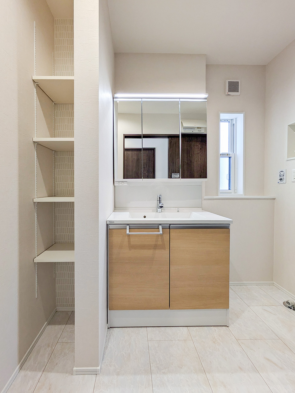 900mm幅の洗面化粧台なので広く使え、毎日の作業もグンと楽になります。ゆとりの収納力でサニタリールームをすっきりと演出します。