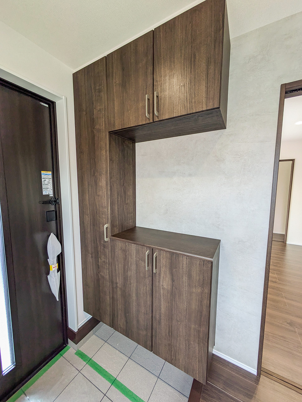 広々とした空間と明るい採光性を確保した玄関エントランス。暗くて狭い玄関スペースのイメージを一新しました。広さを活かして、ベビーカーや自転車・家族で楽しむアウトドア用品などを土間部分に置くこともできます。