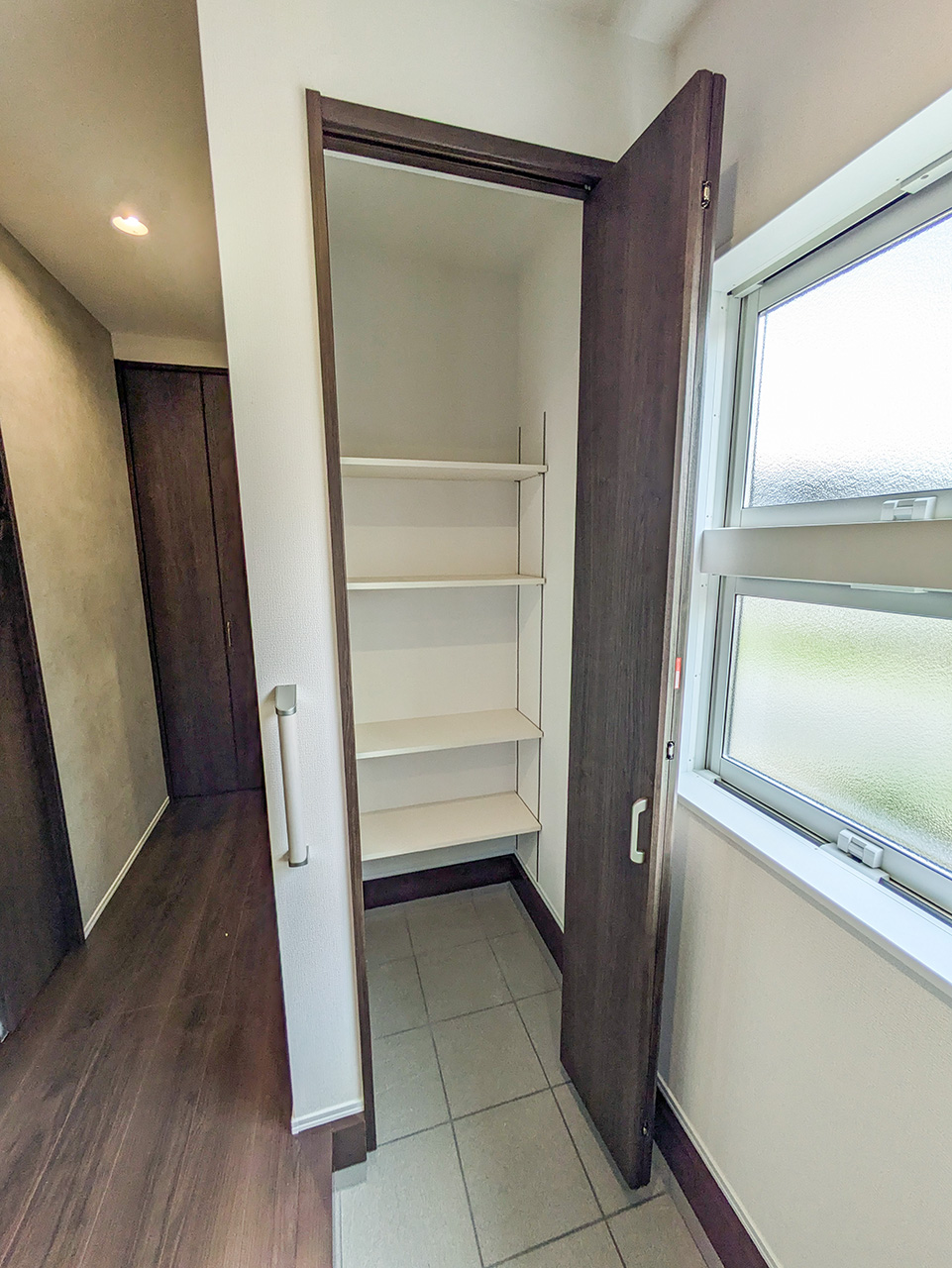 システムキッチンのすぐそばに配置したパントリー。ストック食品や調味料やお酒のほか、非常食や水のペットボトルなどの防災用品も収納できます。キッチンからすぐ手が届く場所にあるから、整理整頓もテキパキできて、キッチン空間をスッキリ保てます。