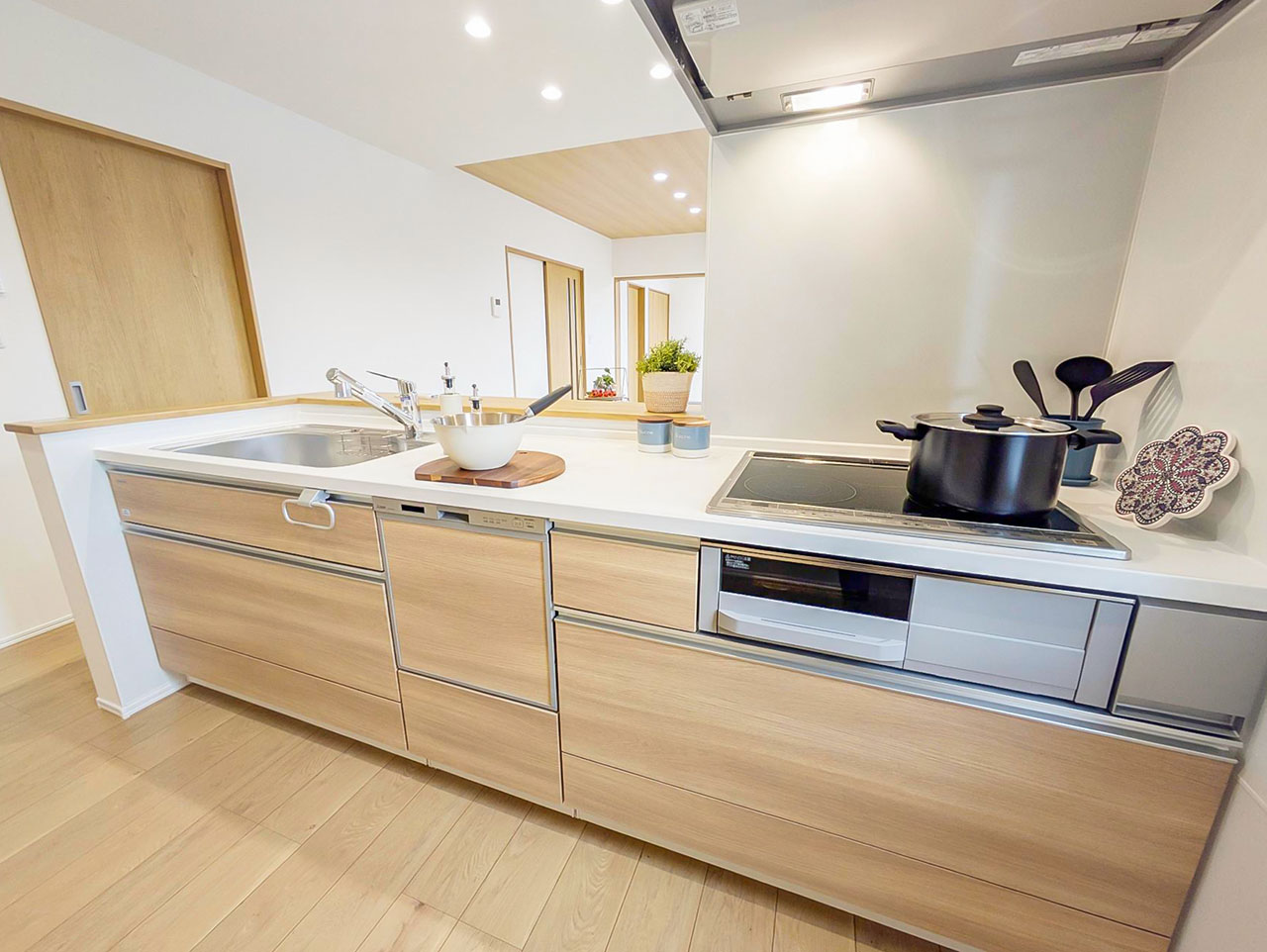 キッチンから洗面室・浴室までを最短距離で結んだ水回り動線設計。家事の移動距離を短縮するとともに、動線上には収納スペースなどをレイアウトし機能性も高めました。スマートな動線設計と時短設備が子育てにがんばるご家族をサポートします。