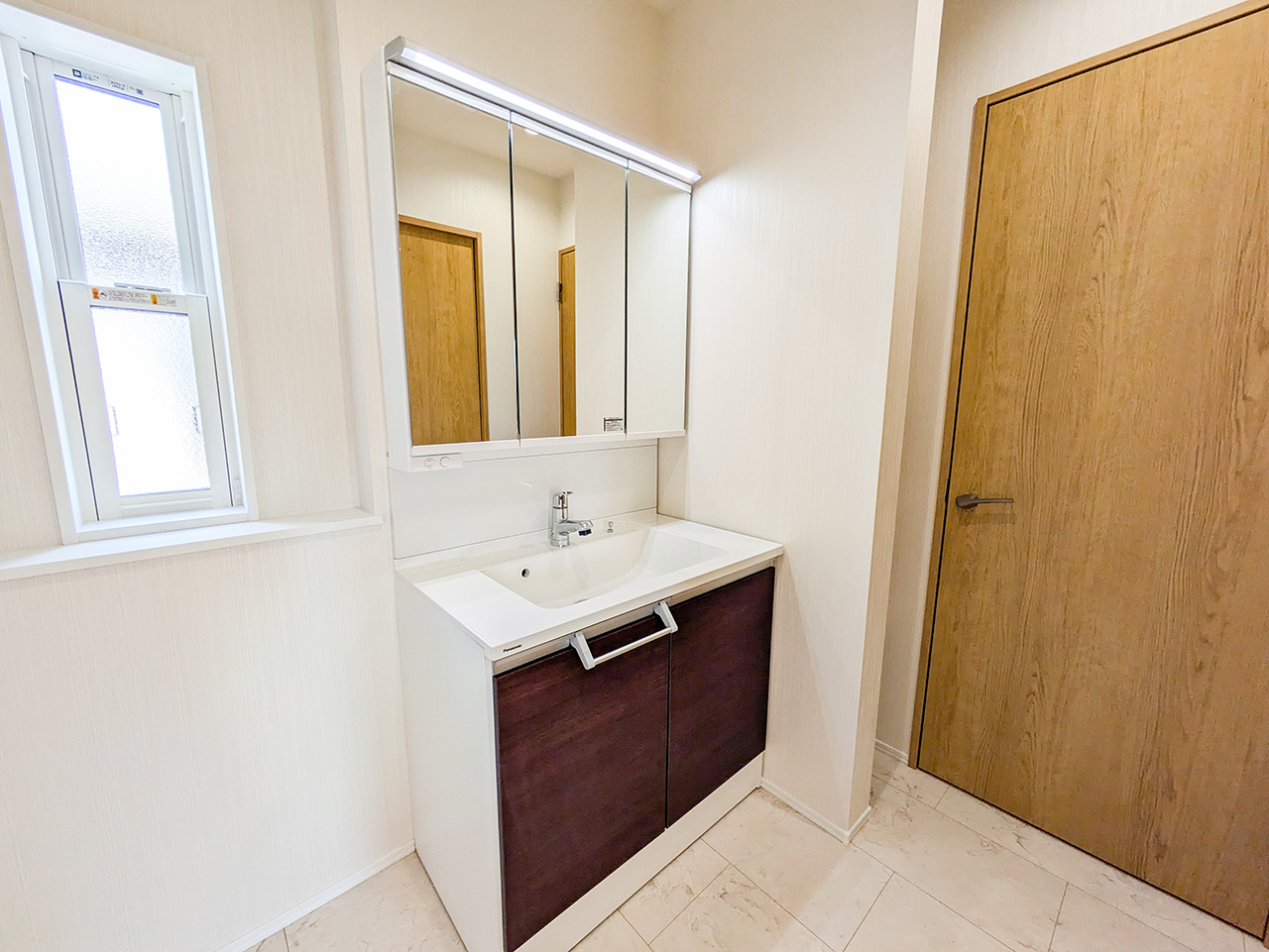 900mm幅の洗面化粧台なので広く使え、毎日の作業もグンと楽になります。ゆとりの収納力でサニタリールームをすっきりと演出します。