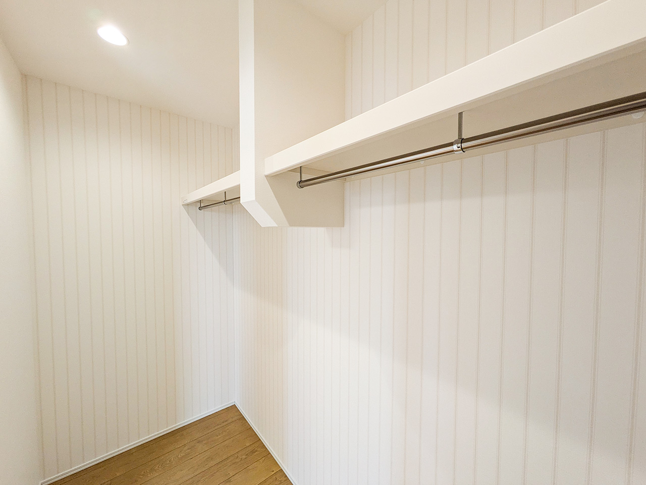 ご夫婦や子ども達の衣類をたっぷりしまえる大容量のウォークインクローゼット。季節の衣類から鞄や帽子などの小物までたっぷり保管可能。ウォークインタイプなので衣類の出し入れや整理整頓もスムーズに行えます。