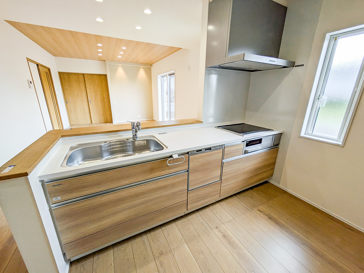 キッチンから洗面室・浴室までを最短距離で結んだ水回り動線設計。家事の移動距離を短縮するとともに、動線上には収納スペースなどをレイアウトし機能性も高めました。スマートな動線設計と時短設備が子育てにがんばるご家族をサポートします。