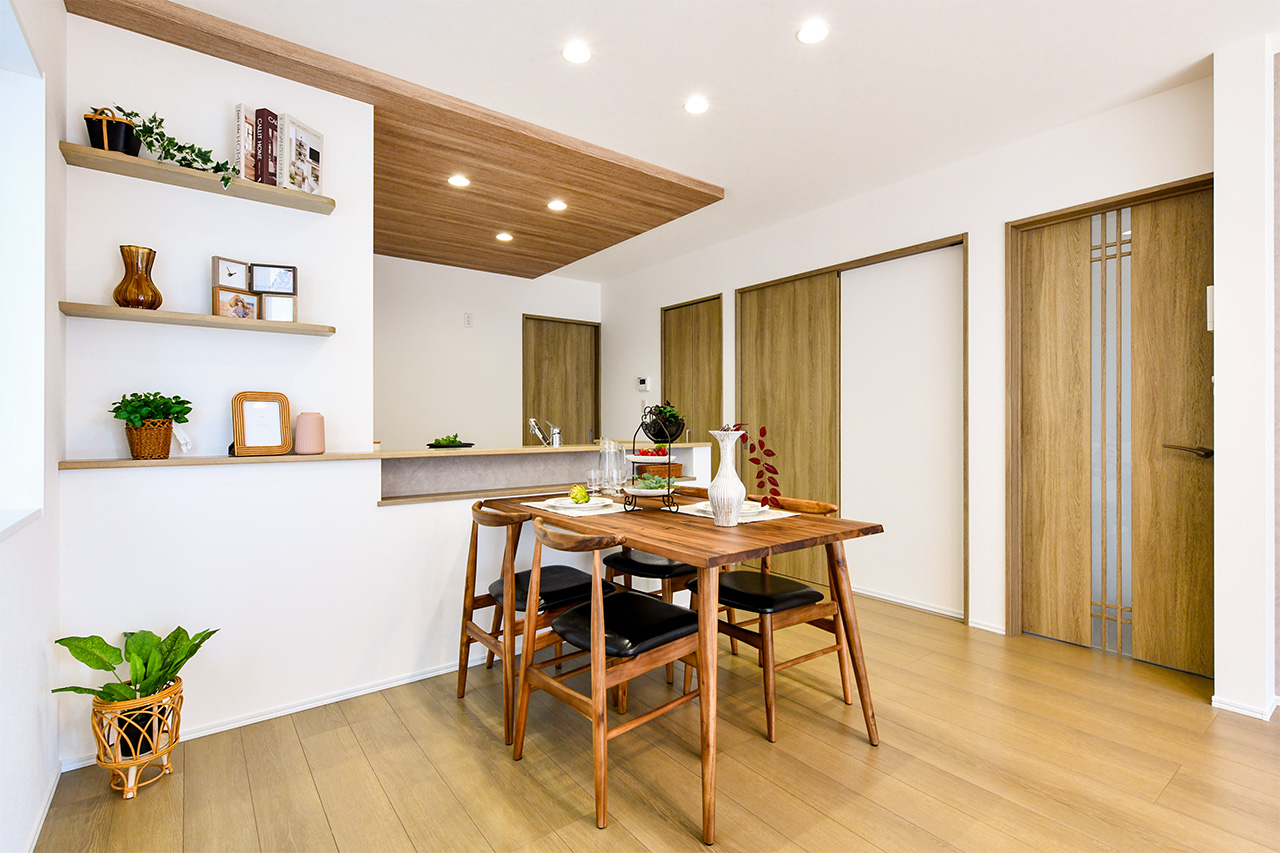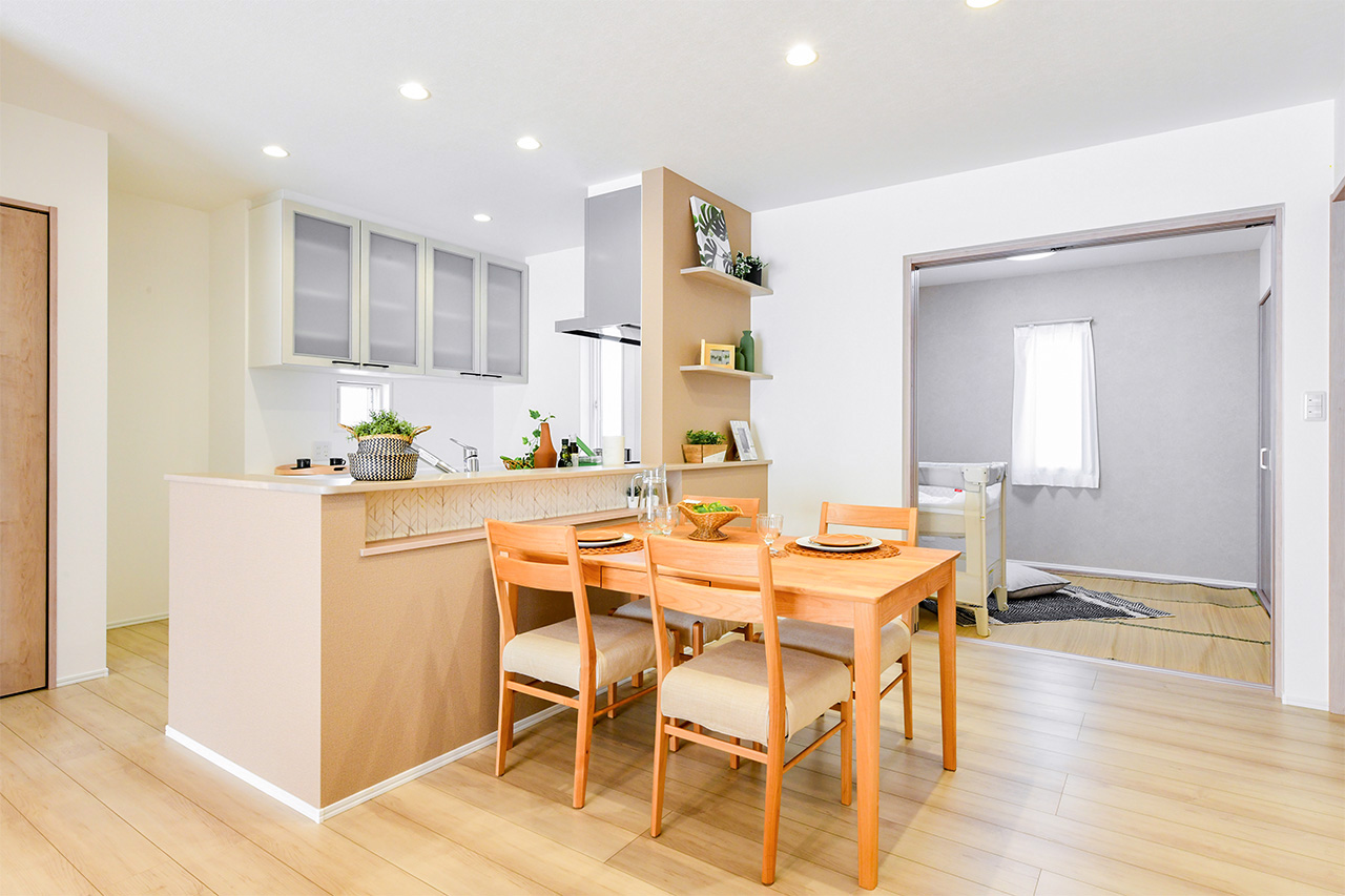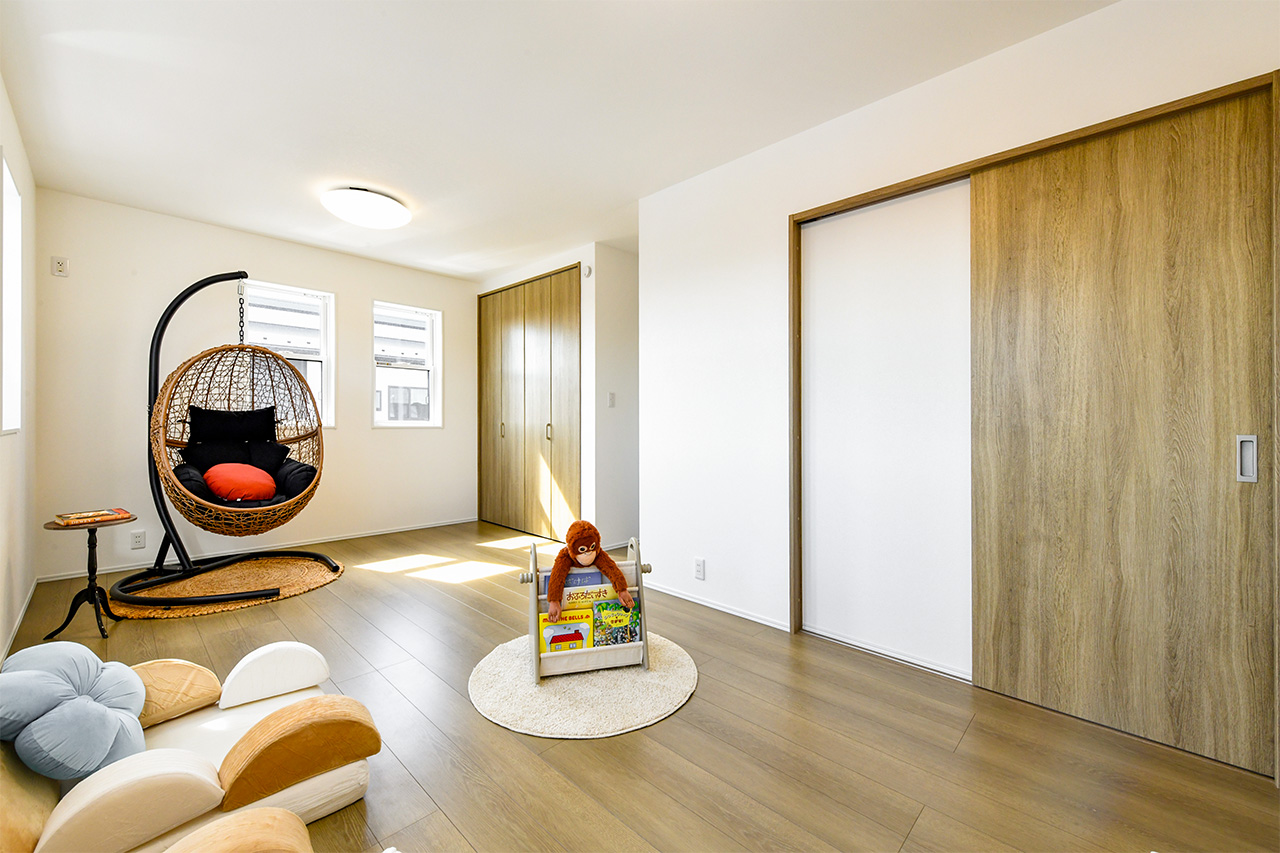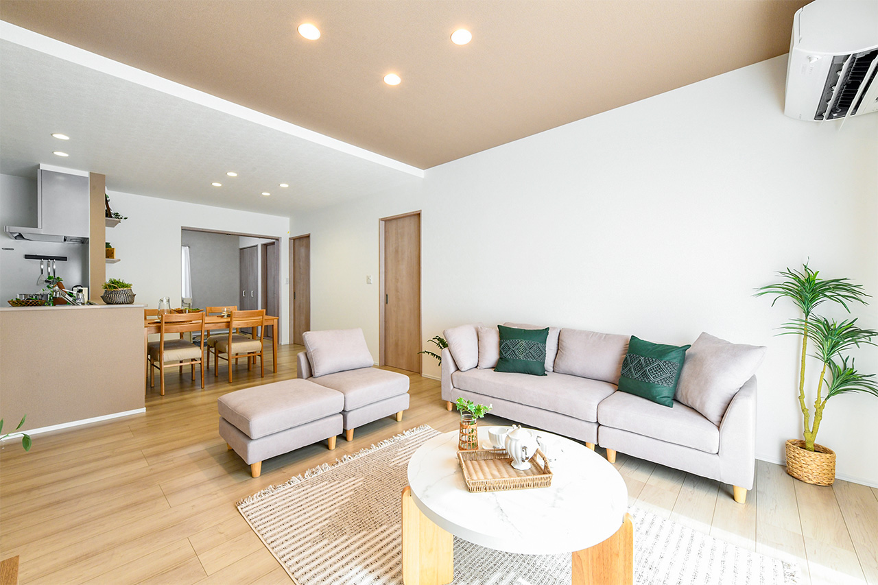 リビングという暮らしのメインスペースは、一日で家族が一番長く過ごす場所。その居心地をさらに高めるために18帖以上のワイドな広さを確保しました。広場のようなパブリックスペースがご家族の集いや団らんを心地よく育みます。