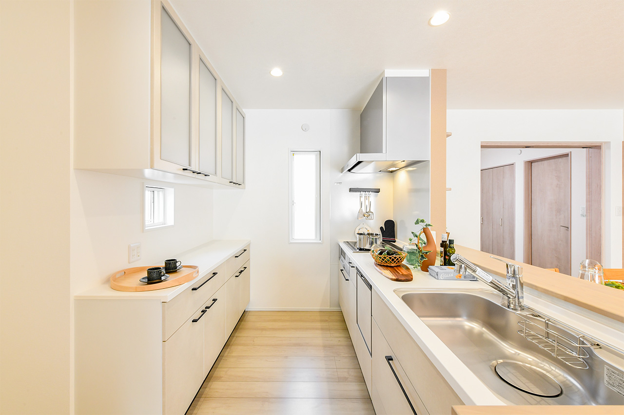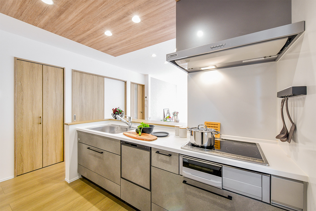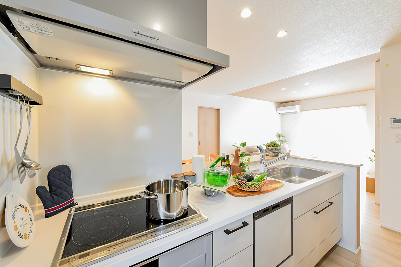 家族でのコミュニケーションがとれる対面型システムキッチン。横一列にシンクとコンロをまとめたシンプルな形です。動きやすさとスタイリッシュなデザインが魅力。