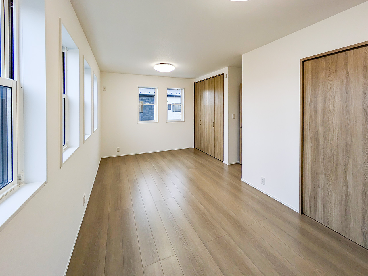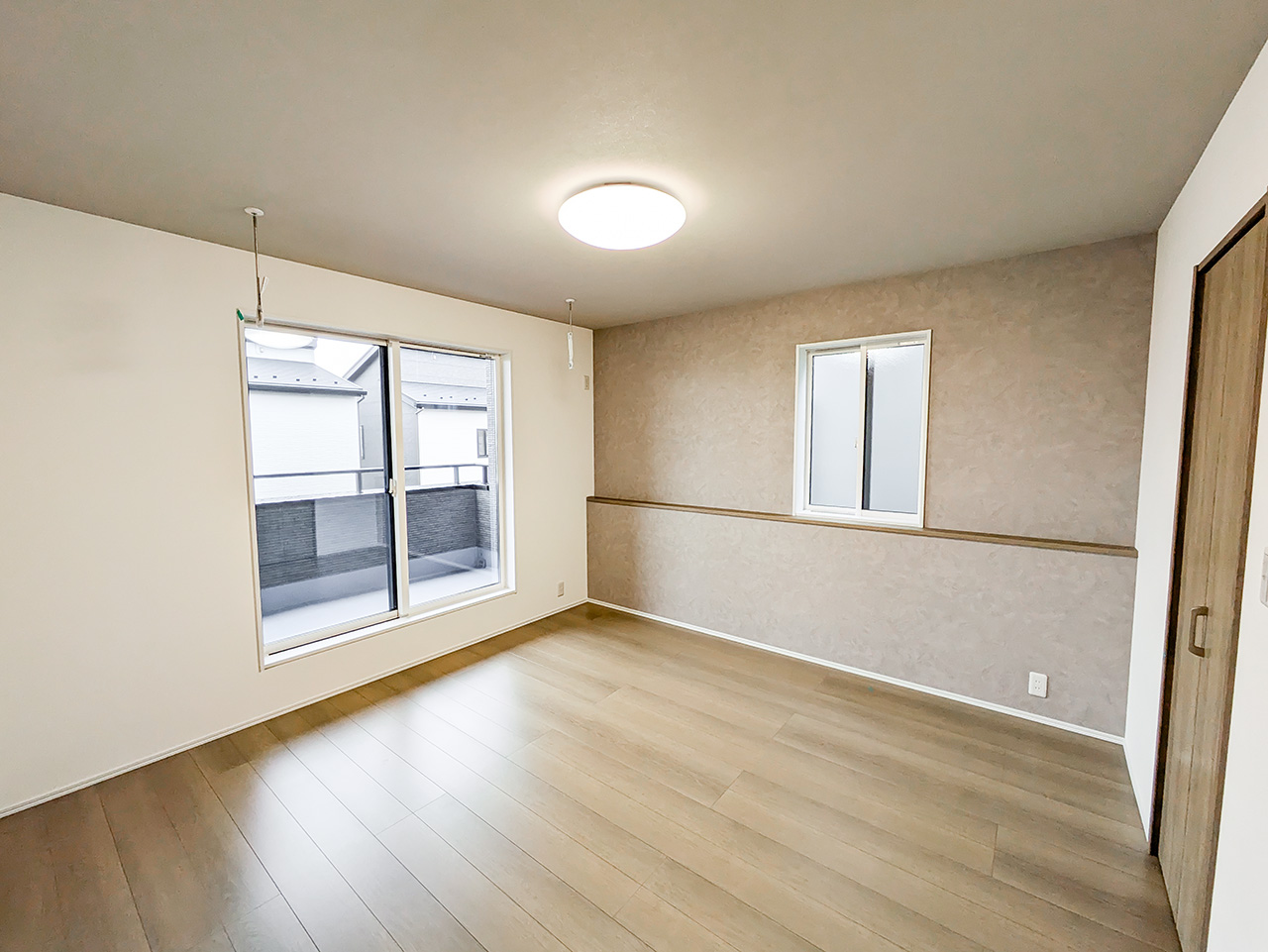 2つの空間に間仕切り可能な、広々とした2階2ドア1ルーム。子供が生まれる前、赤ちゃんが生まれてから、そして大きくなって個室を持つようになるまで対応。子ども達が独立したら広々としたご夫婦の書斎や趣味の部屋にも。ご家族の成長といっしょに変わっていく自由な家づくりが可能です。※間仕切り壁の設置は有料オプションとなります。