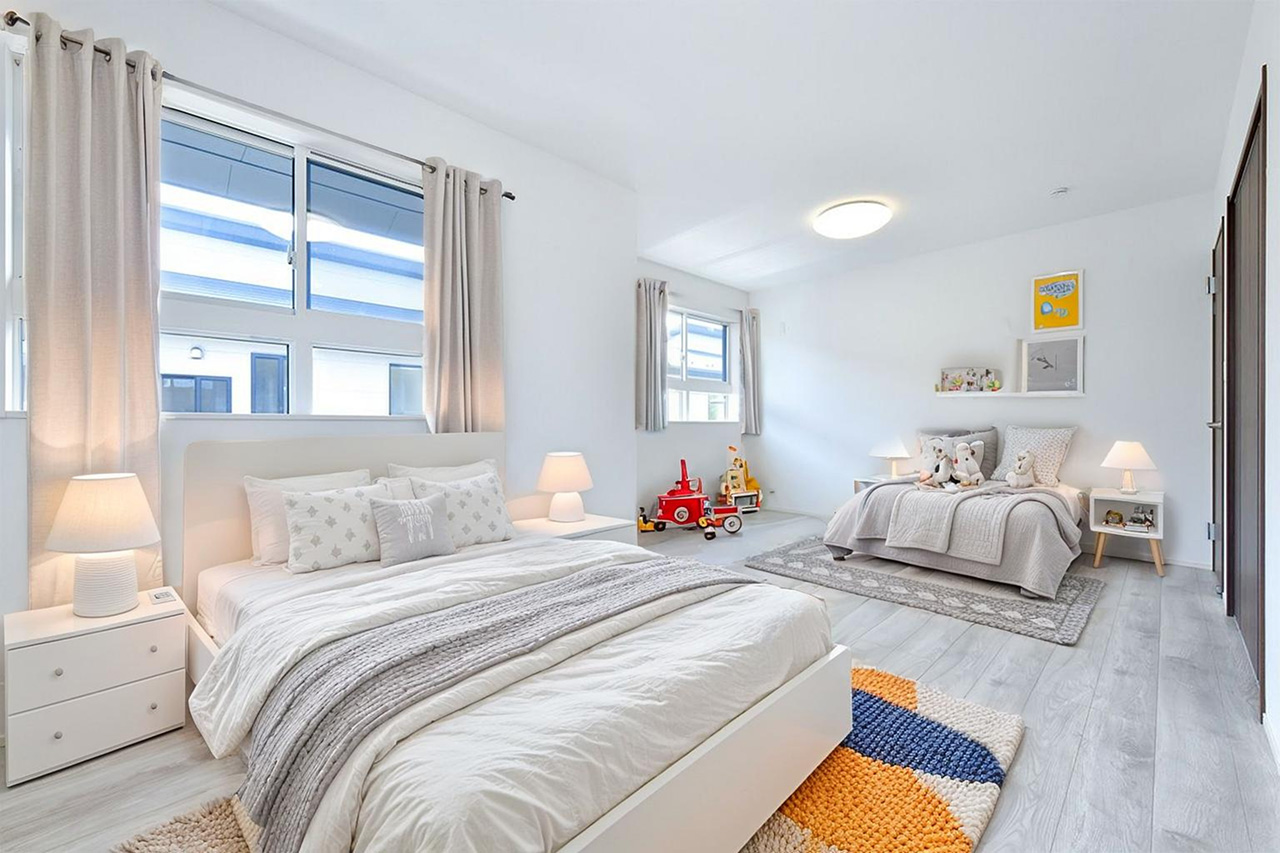 2つの空間に間仕切り可能な、広々とした2階2ドア1ルーム。子供が生まれる前、赤ちゃんが生まれてから、そして大きくなって個室を持つようになるまで対応。子ども達が独立したら広々としたご夫婦の書斎や趣味の部屋にも。ご家族の成長といっしょに変わっていく自由な家づくりが可能です。※間仕切り壁の設置は有料オプションとなります。