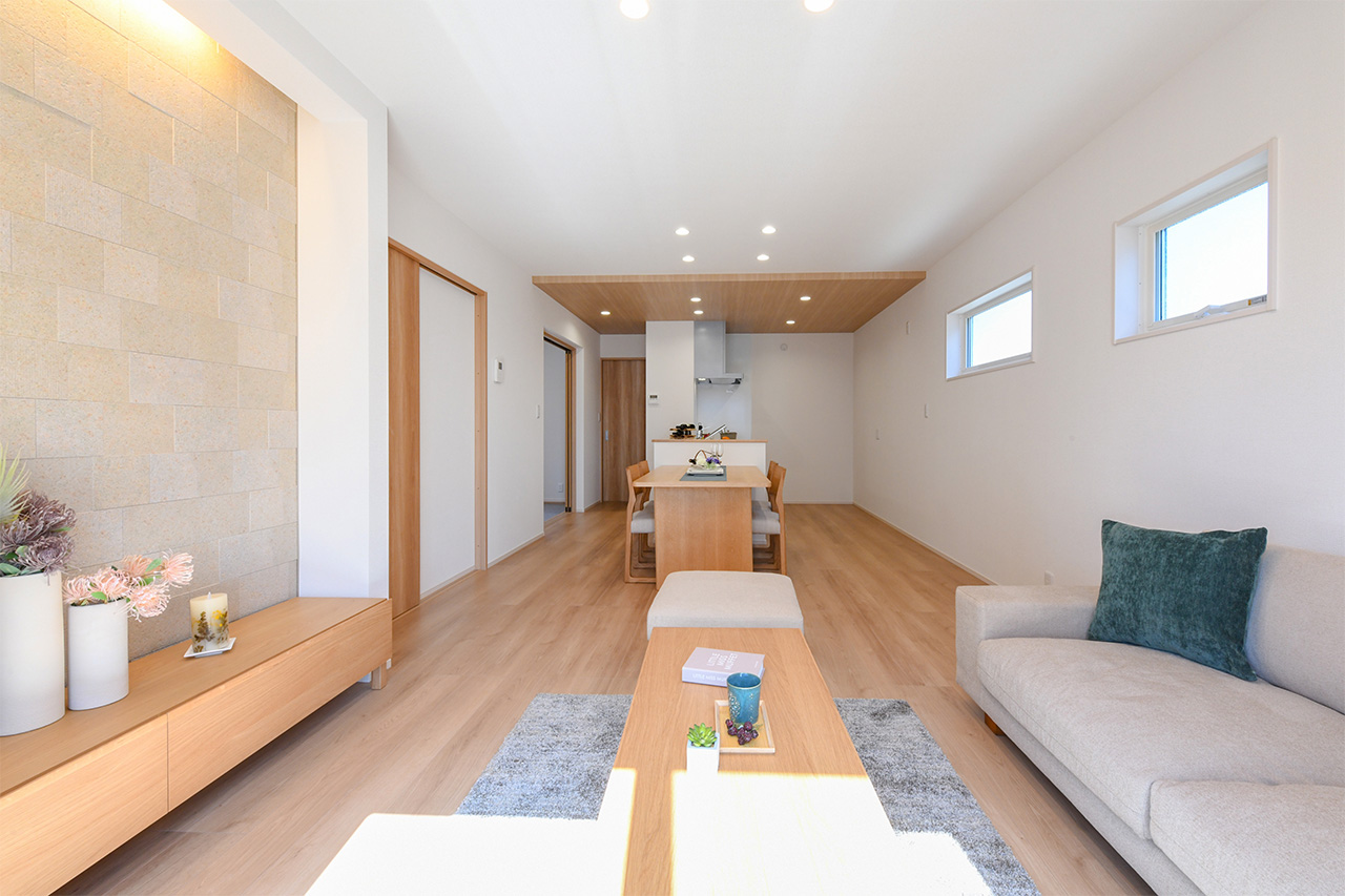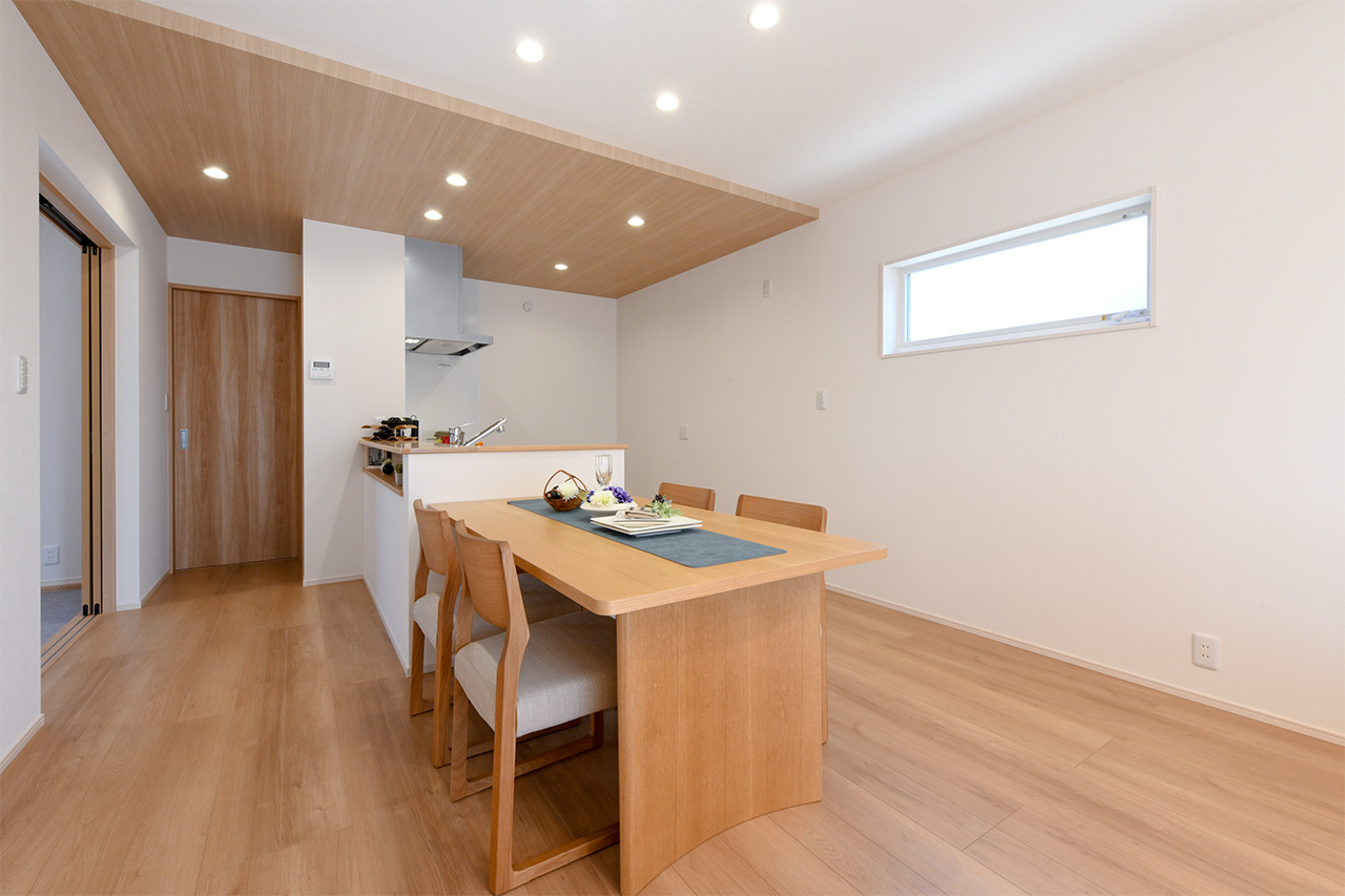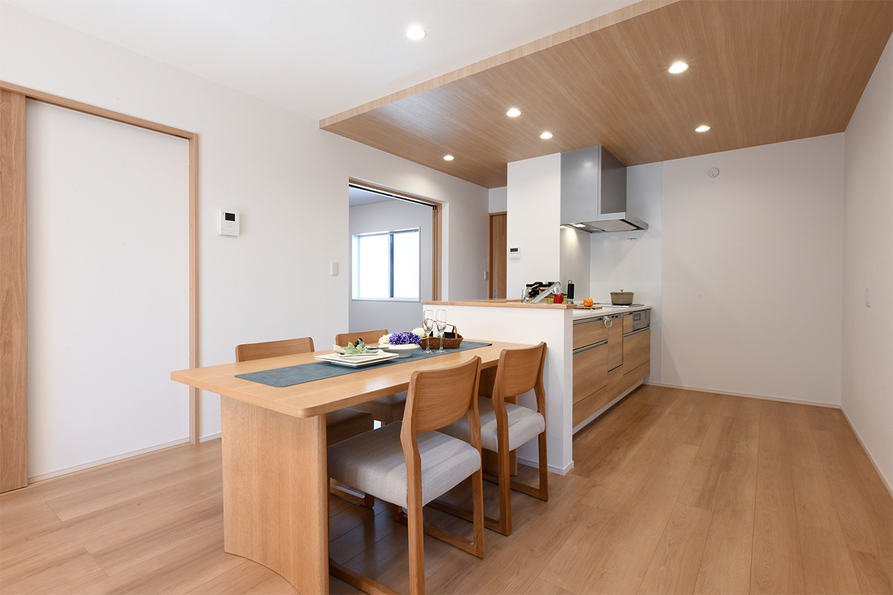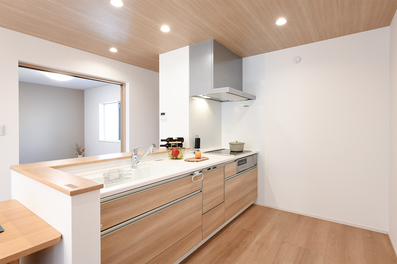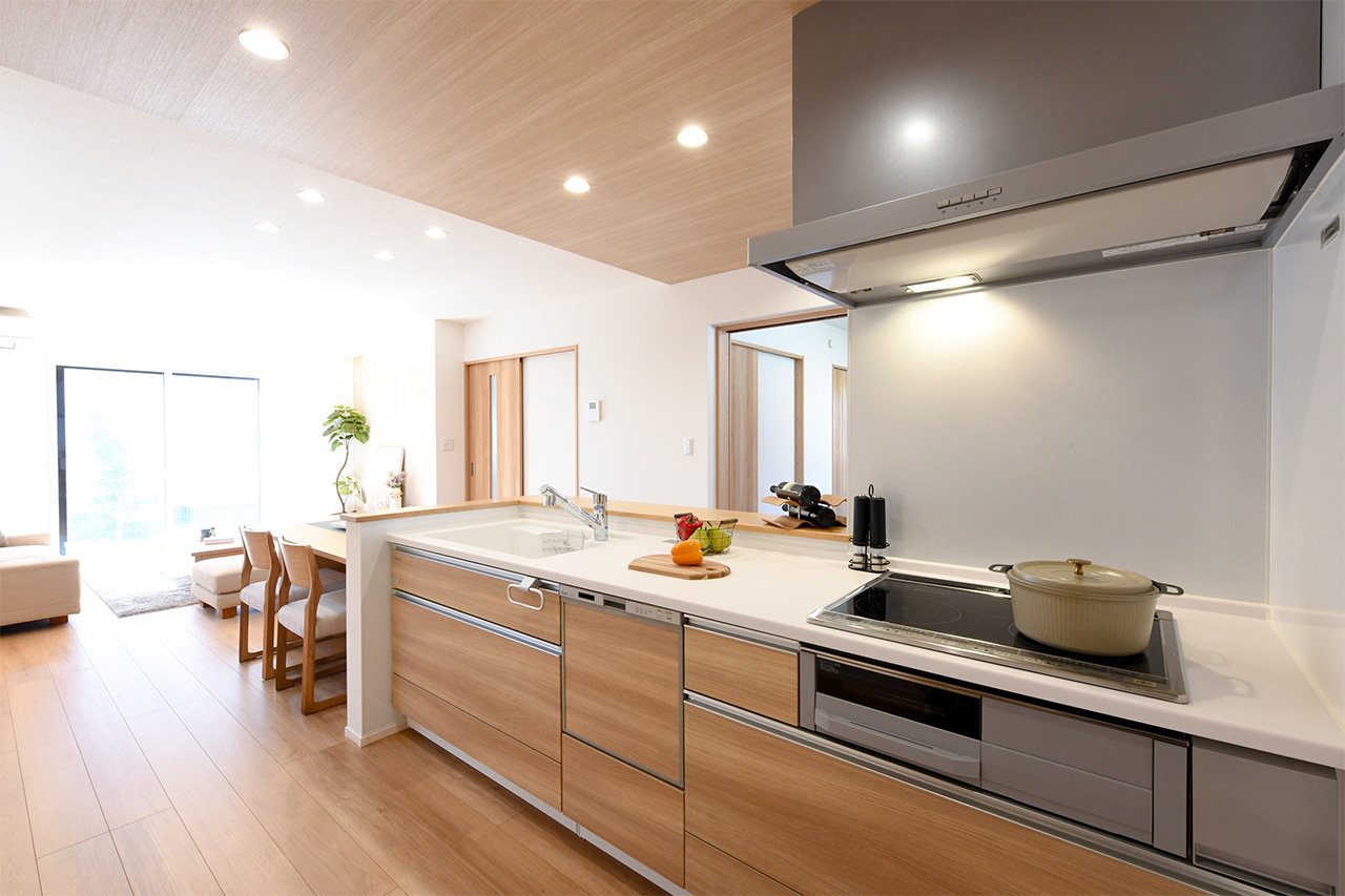 LDK空間の広さをより実感できるオープンキッチン。開放的で目線を遮るものがなくコミュニケーションが取りやすいため、料理をしながらの会話も弾み、お手伝いにも気軽に参加できます。