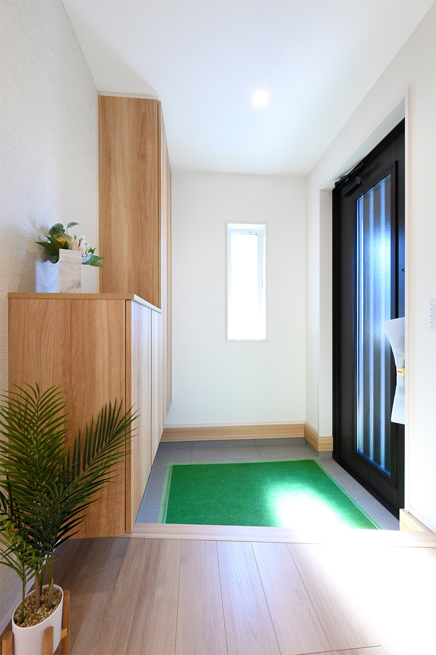 人の動きを感知して自動的に点灯する人感センサー付玄関照明を採用しました。ご家族の帰宅を明るく迎えるだけでなく、不意なライトの光が侵入者への警告になります。