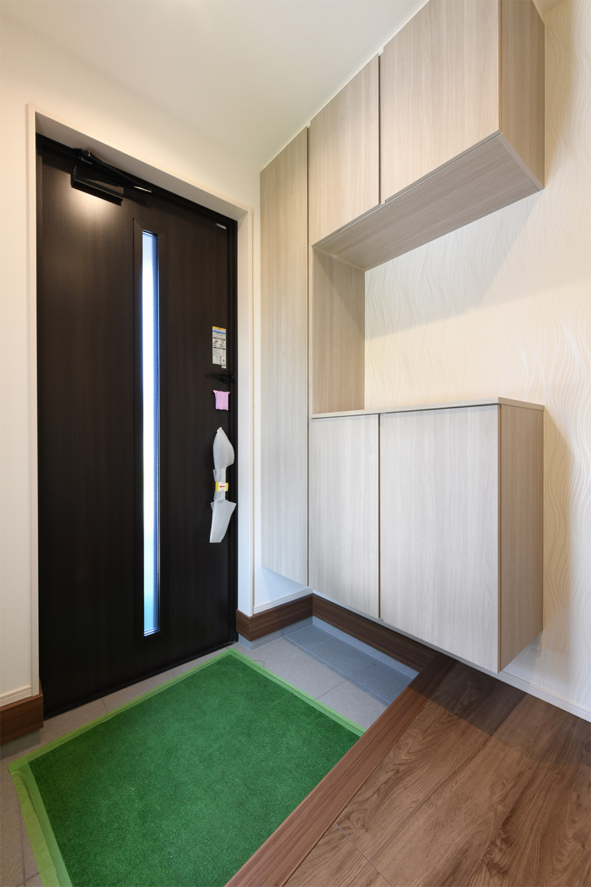 人の動きを感知して自動的に点灯する人感センサー付玄関照明を採用しました。ご家族の帰宅を明るく迎えるだけでなく、不意なライトの光が侵入者への警告になります。