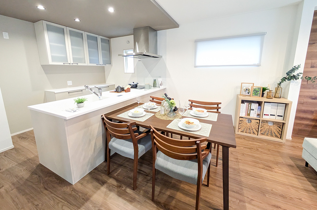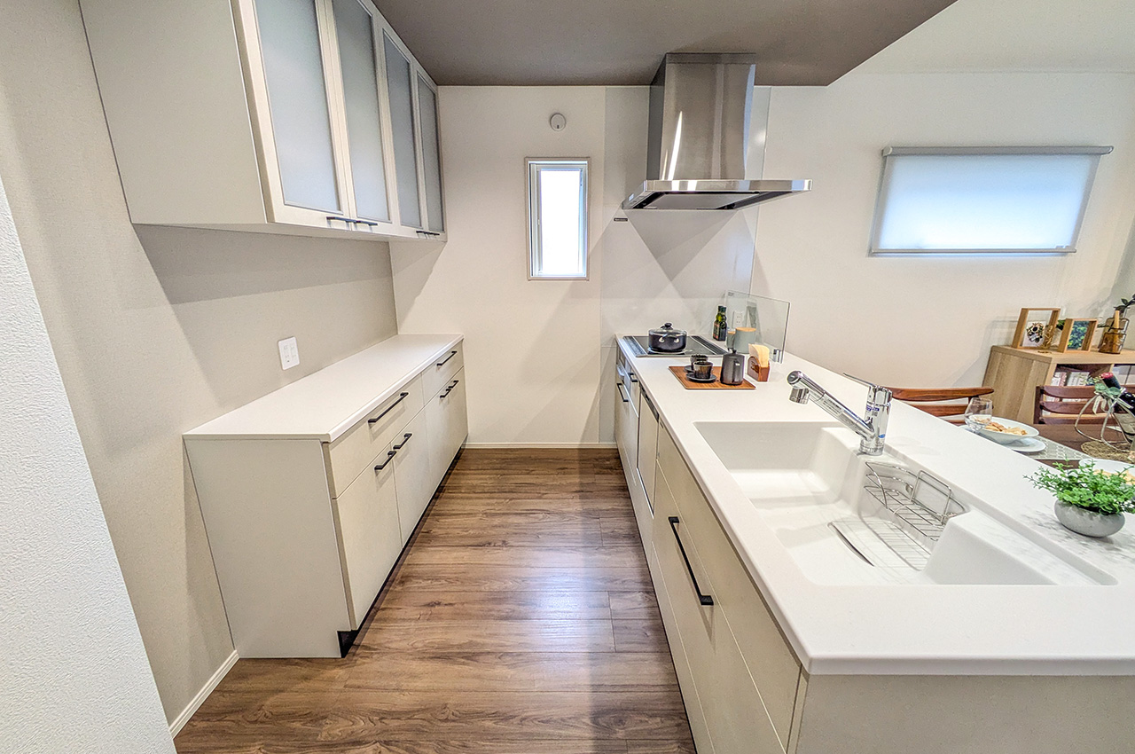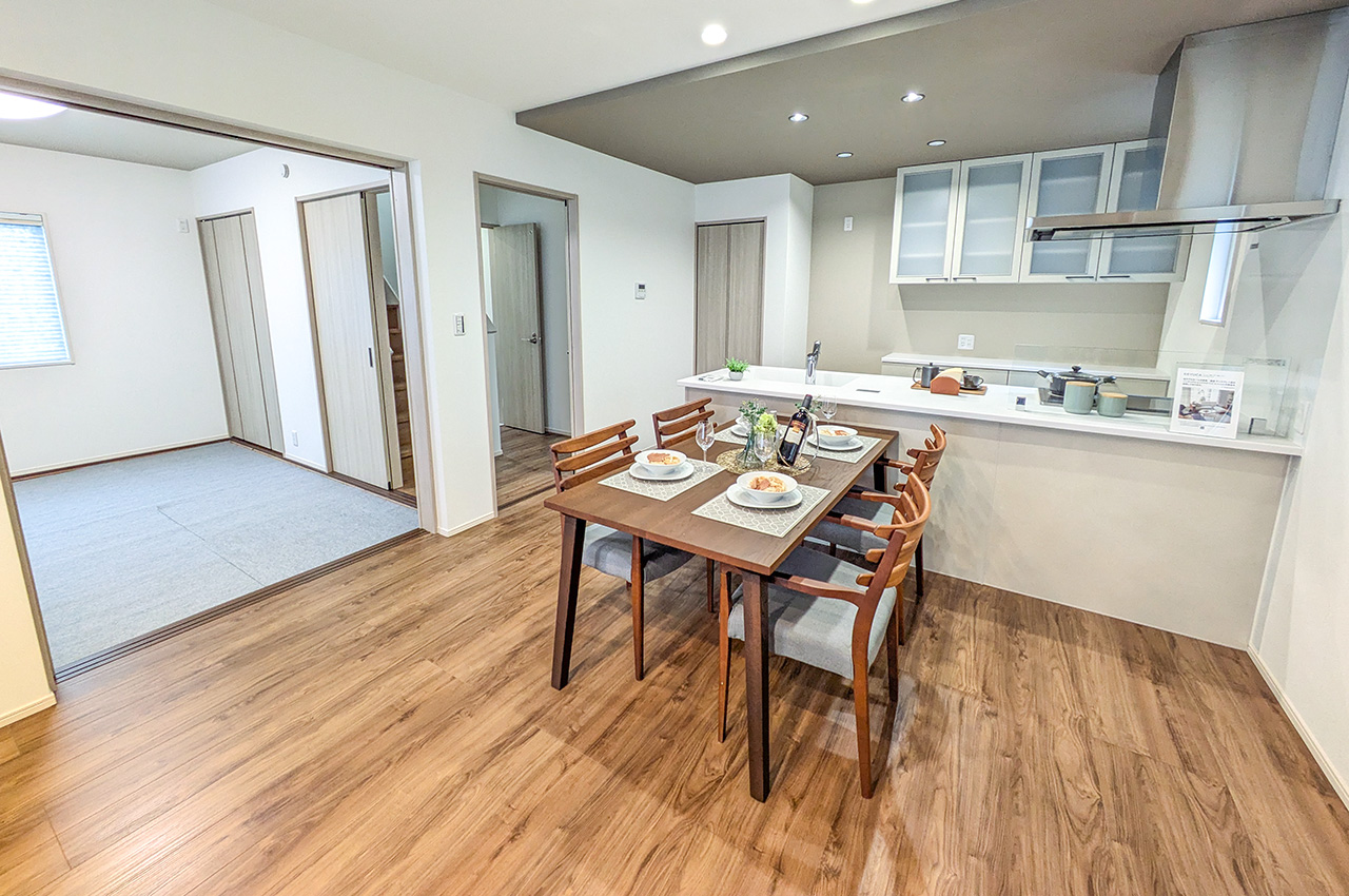 LDK空間の広さをより実感できるオープンキッチン。開放的で目線を遮るものがなくコミュニケーションが取りやすいため、料理をしながらの会話も弾み、お手伝いにも気軽に参加できます。
