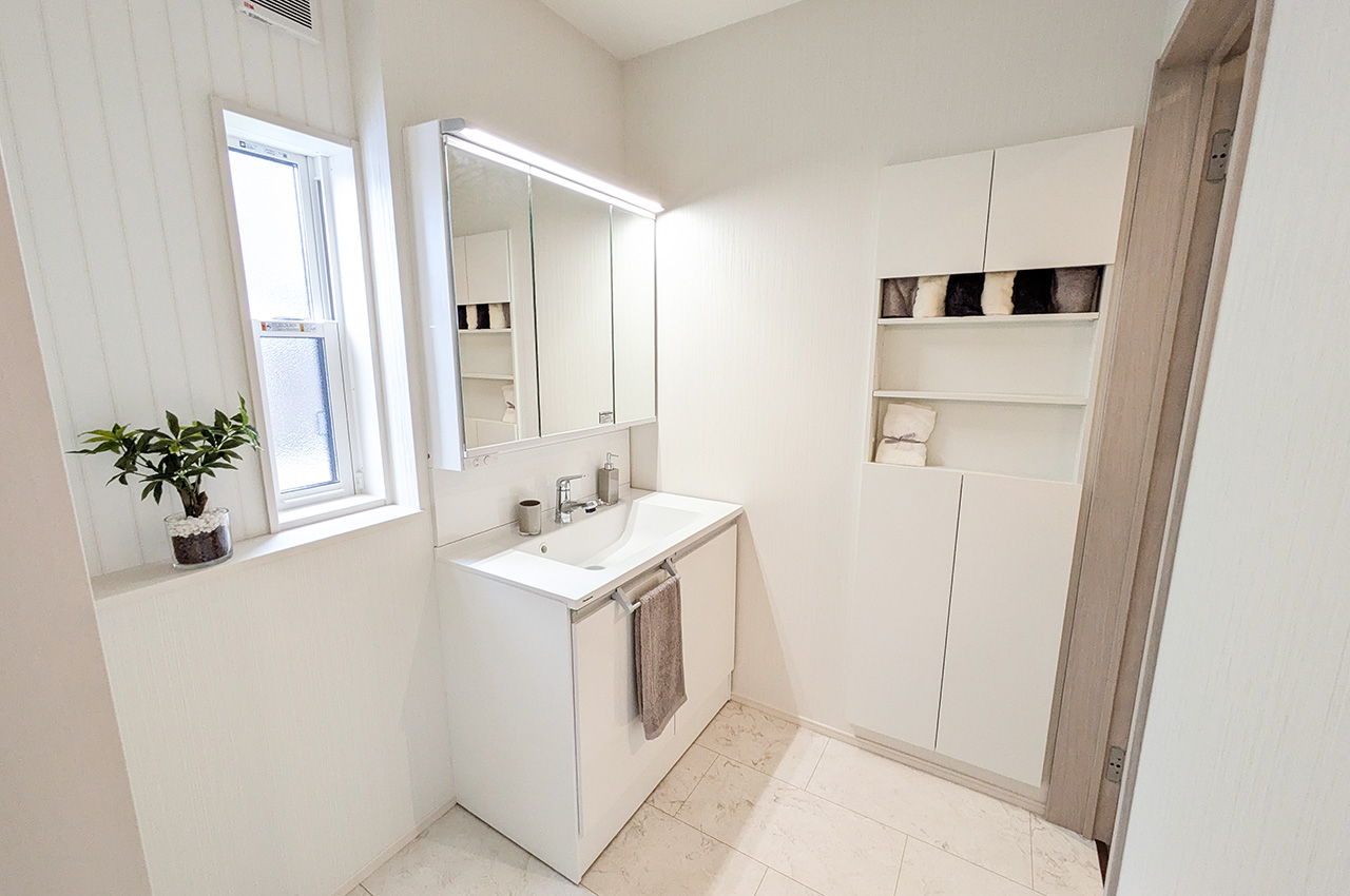 900mm幅の洗面化粧台なので広く使え、毎日の作業もグンと楽になります。ゆとりの収納力でサニタリールームをすっきりと演出します。