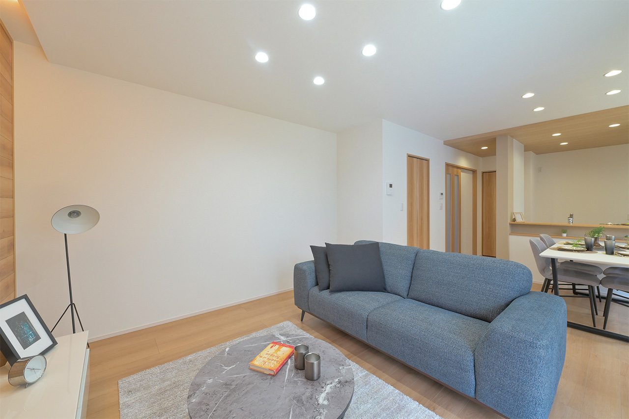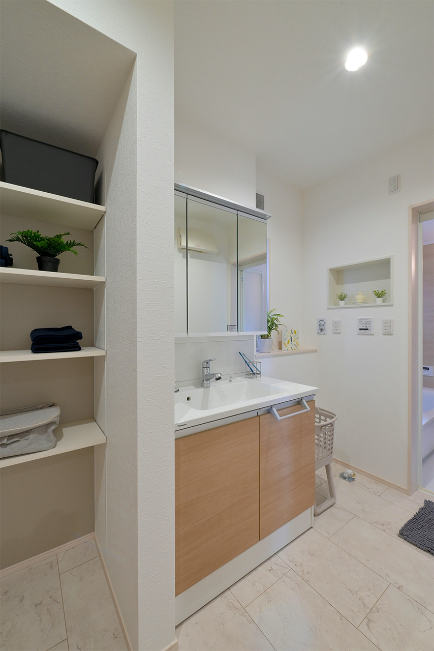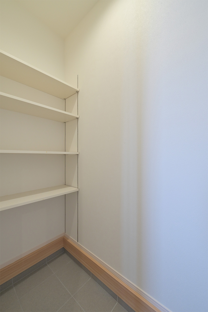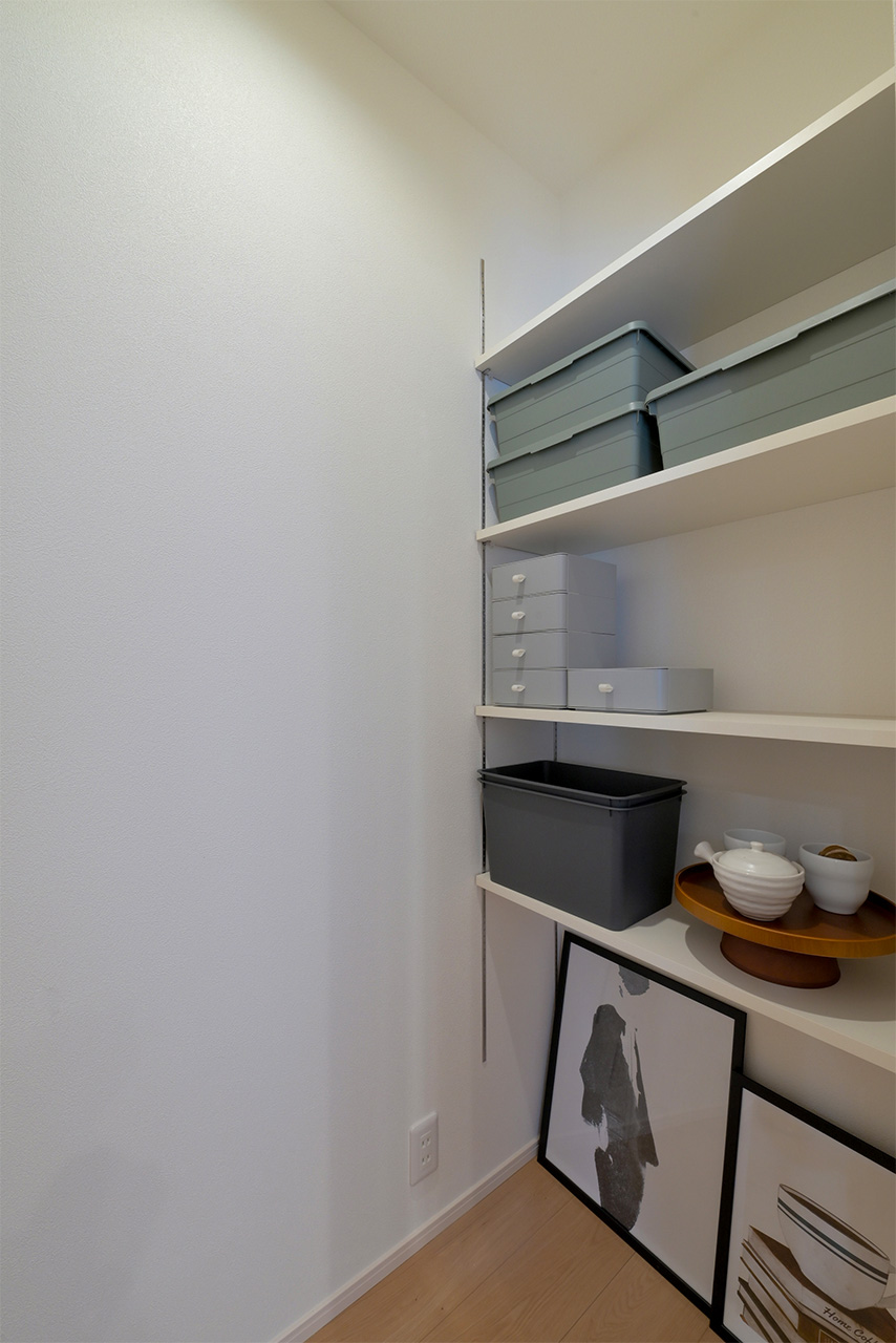 リビングそばに、家族がみんなが使いやすいたっぷり収納できるストレージをご用意。日用品や生活雑貨はもちろん、お子様のおもちゃなど、様々な収納に活用できます。日常の収納以外にも、来客時には、散らかった雑誌やおもちゃなども手早く片づける事ができます。