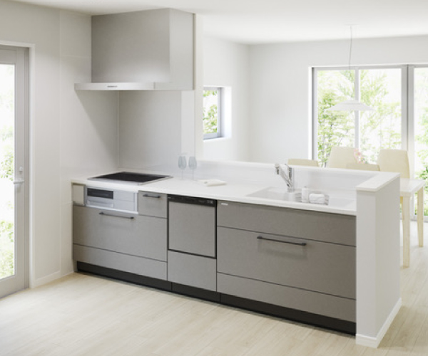 家族でのコミュニケーションがとれる対面型システムキッチンです。横一列にシンクとコンロをまとめたシンプルな形です。動きやすさとスタイリッシュなデザインが魅力です。