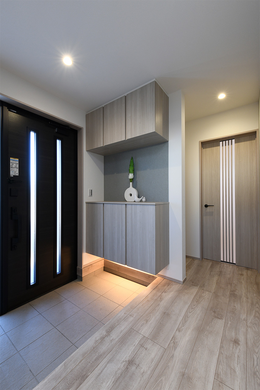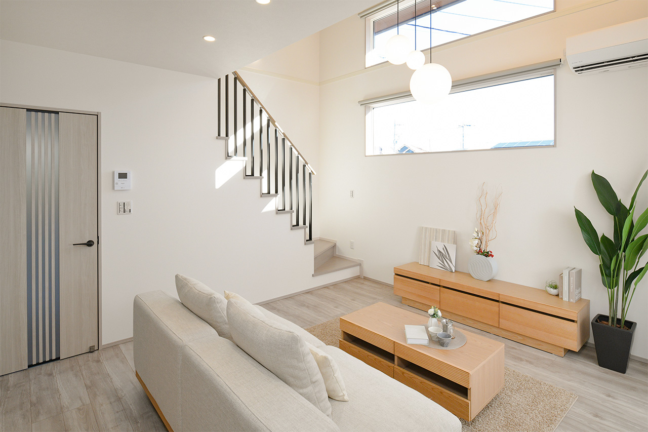 ご家族の団らんや寛ぎの中心となるリビング空間をさらに際立たせる吹抜け天井プラン。2階天井まで続くその圧倒的な存在感と広がりが訪れた方を驚きを持ってお迎えします。大切にしたいご家族やゲストをもてなす上質な空間です。