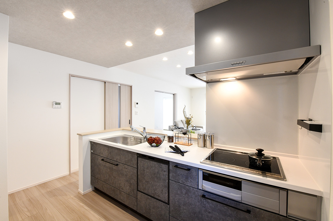 家族でのコミュニケーションがとれる対面型システムキッチン。横一列にシンクとコンロをまとめたシンプルな形です。動きやすさとスタイリッシュなデザインが魅力。