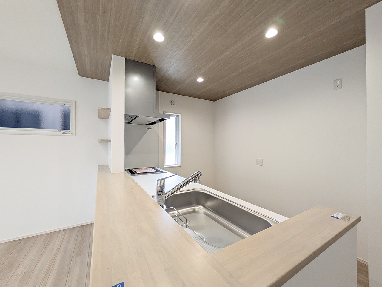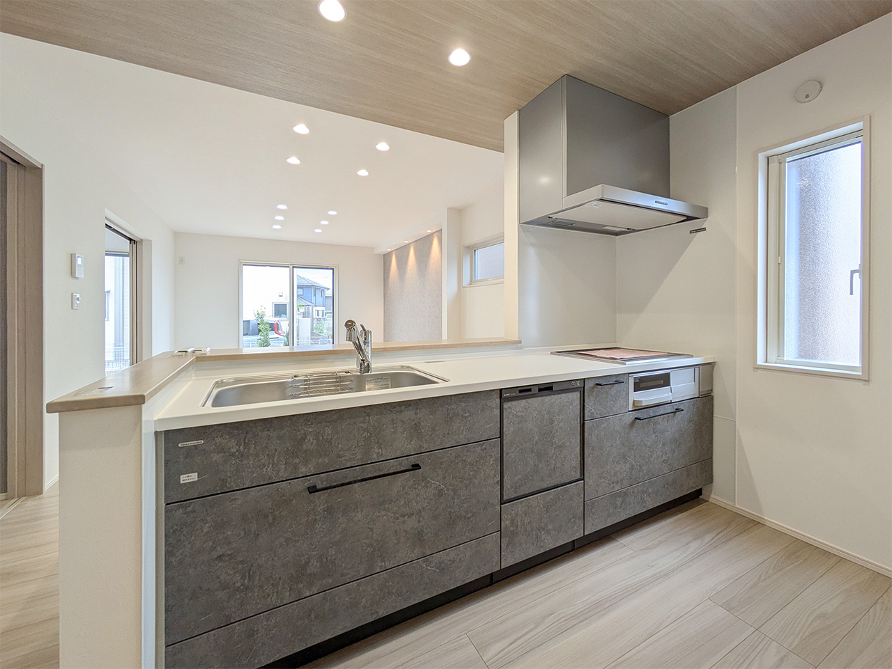 家族でのコミュニケーションがとれる対面型システムキッチン。横一列にシンクとコンロをまとめたシンプルな形です。動きやすさとスタイリッシュなデザインが魅力。