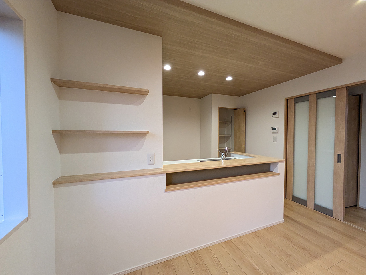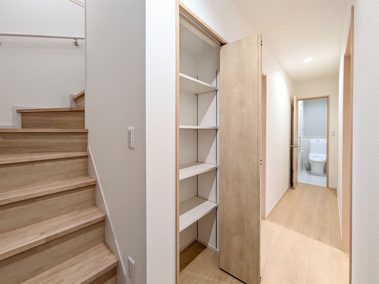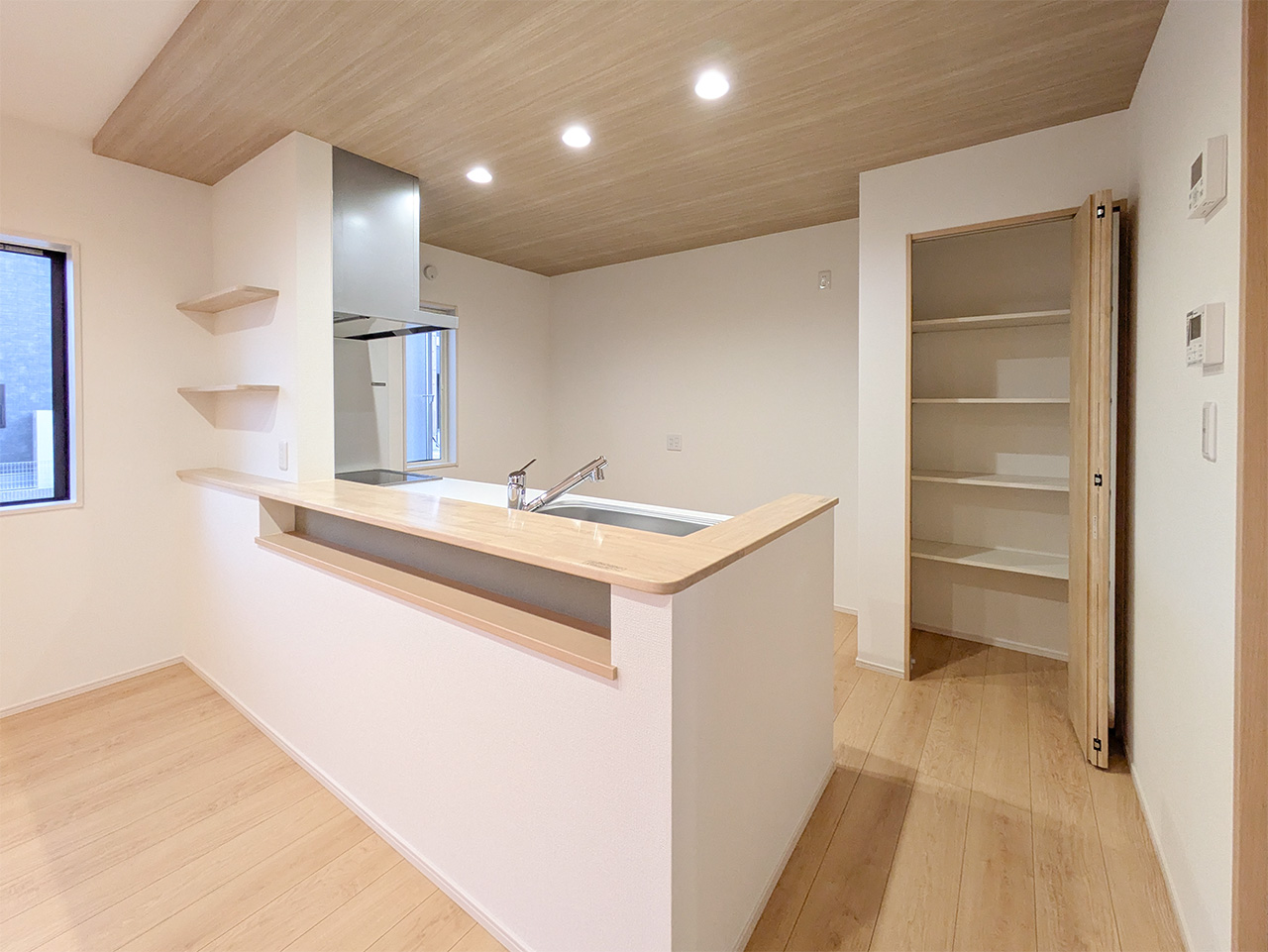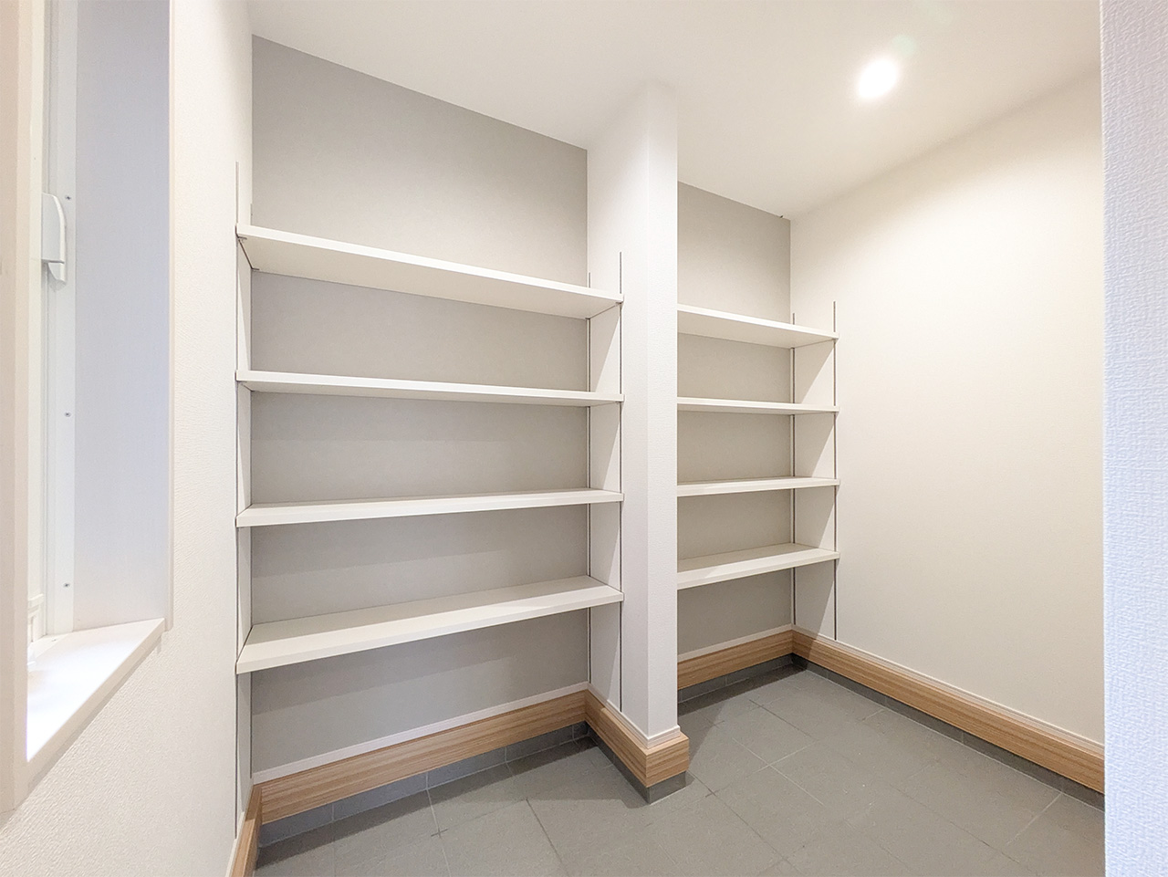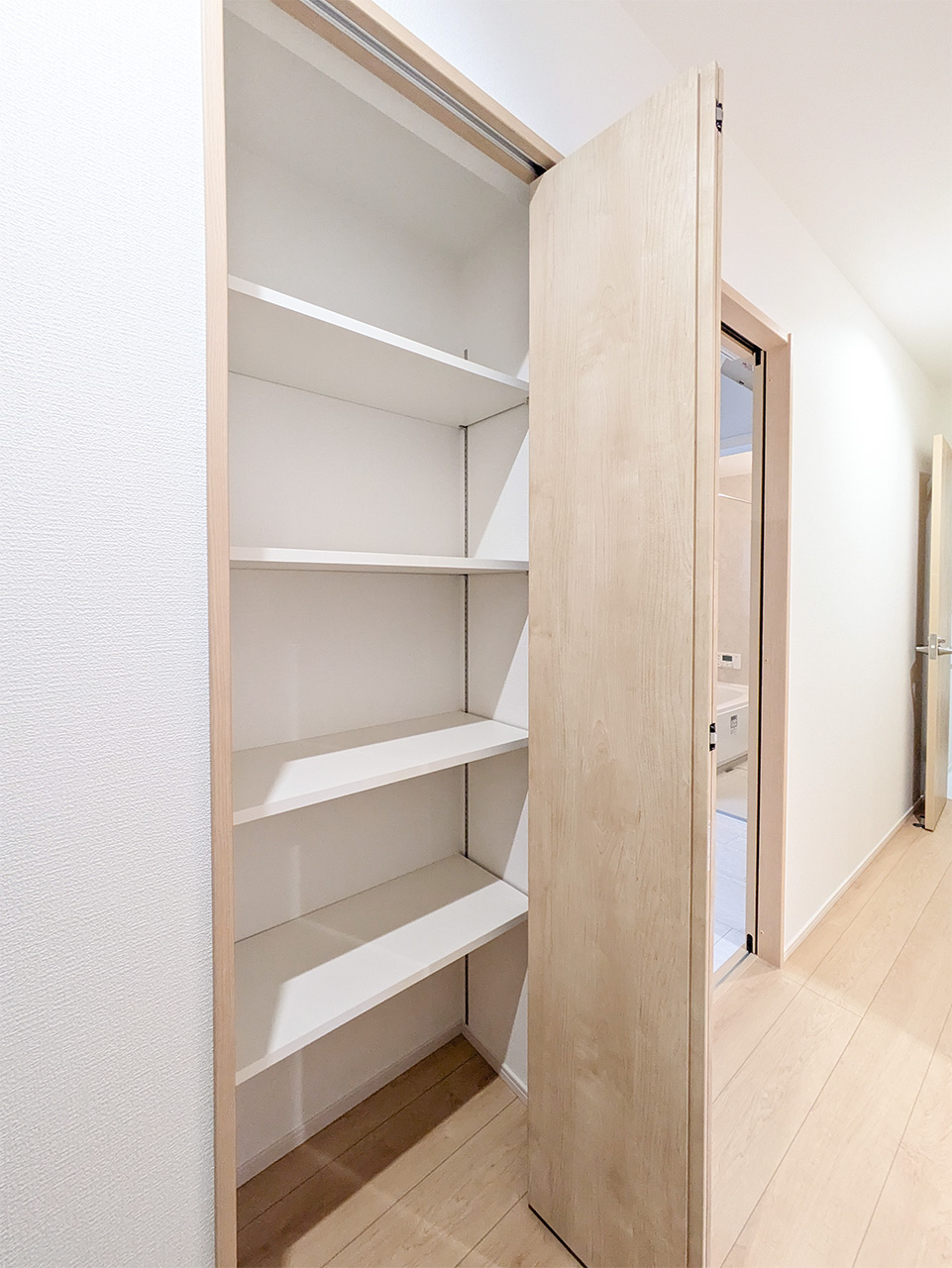 システムキッチンのすぐそばに配置したパントリー。ストック食品や調味料やお酒のほか、非常食や水のペットボトルなどの防災用品も収納できます。キッチンからすぐ手が届く場所にあるから、整理整頓もテキパキできて、キッチン空間をスッキリ保てます。