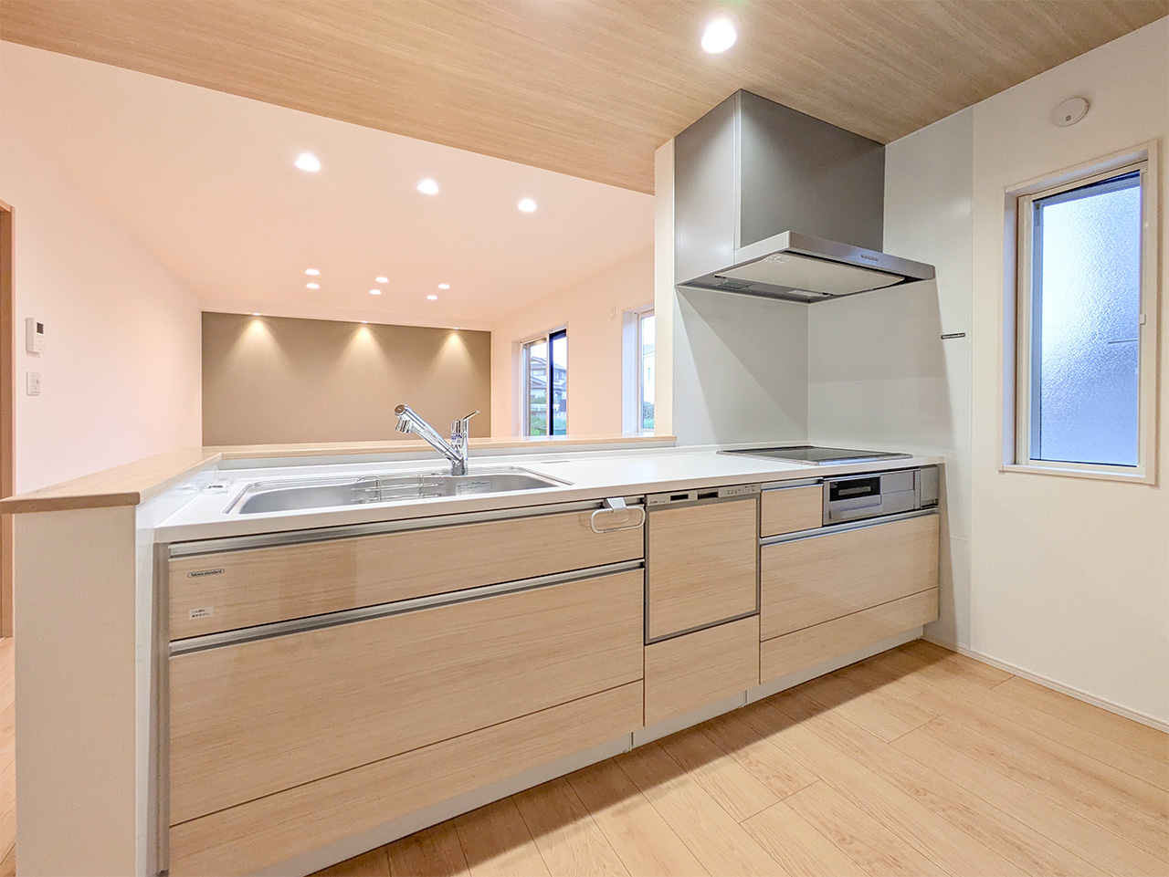 家族でのコミュニケーションがとれる対面型システムキッチン。横一列にシンクとコンロをまとめたシンプルな形です。動きやすさとスタイリッシュなデザインが魅力。